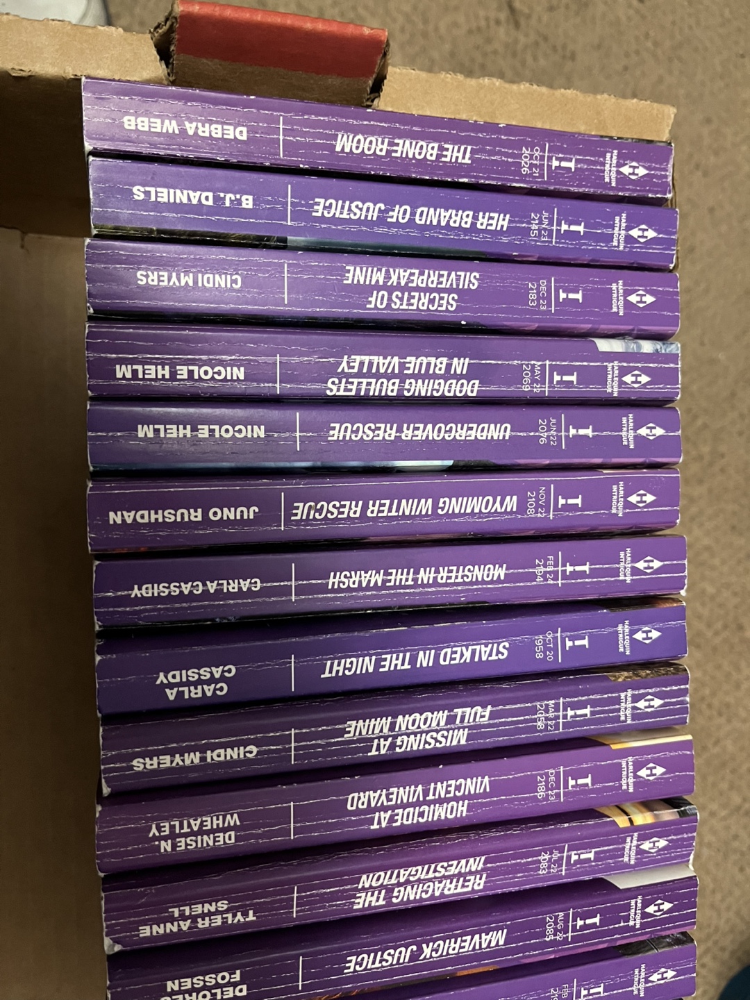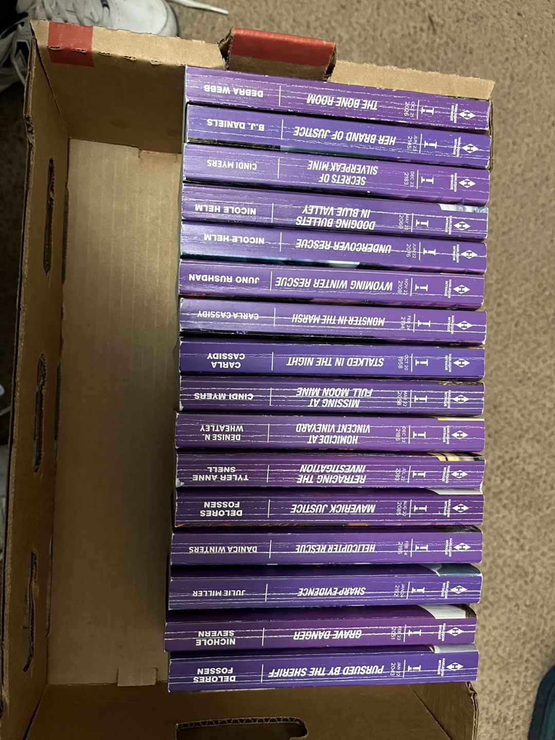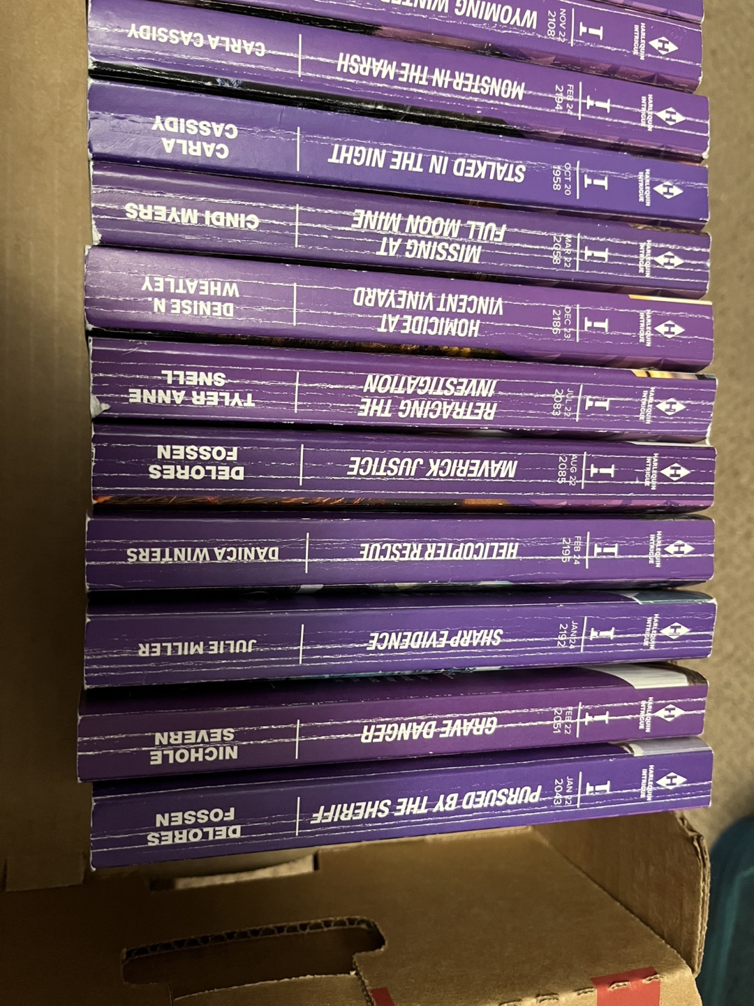 Set of 20 Intrigue novels. Mass market paperbacks. Authors include: Delores Fossen, Julie Miller, Danica Winters, Tyler Anne Snell, Denise N. Wheatley, Cindi Myers, Carla Cassidy, Juno Rushdan, Nicole Helm, B.J. Daniels, Debra Webb.