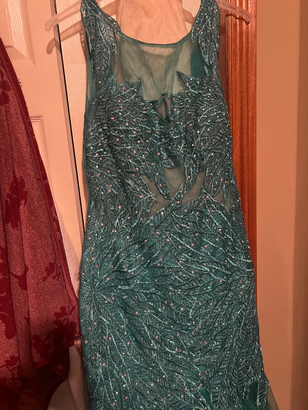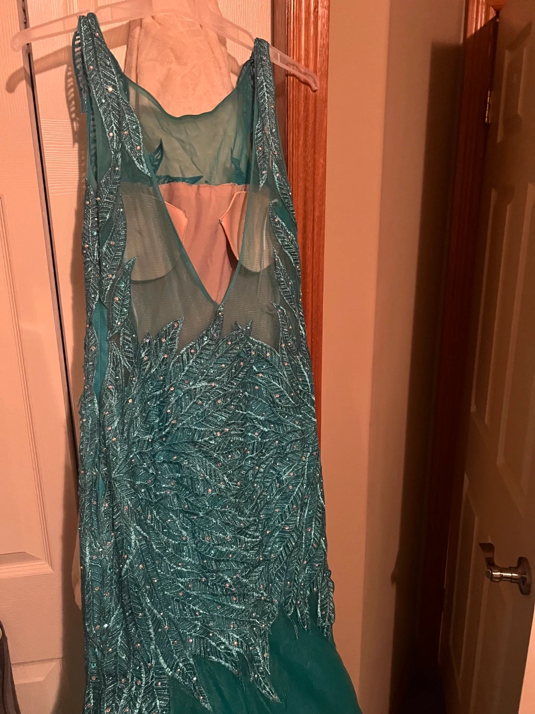 This is a stunning sleeveless formal gown with intricate beading and sequin details. It has a sheer illusion neckline and back panel. The skirt is a mermaid style, flowing into a tulle hem. Each dress is $300 obo