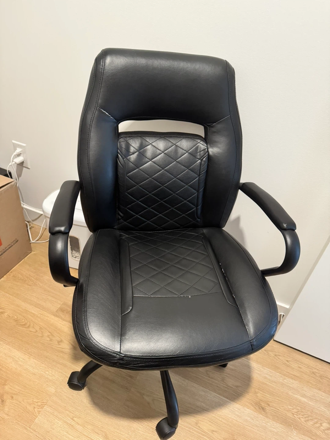 This is a black faux leather office chair with diamond stitching on the seat and back. It's a standard office chair with wheels and armrests. Some minor wear on the seat cushion.