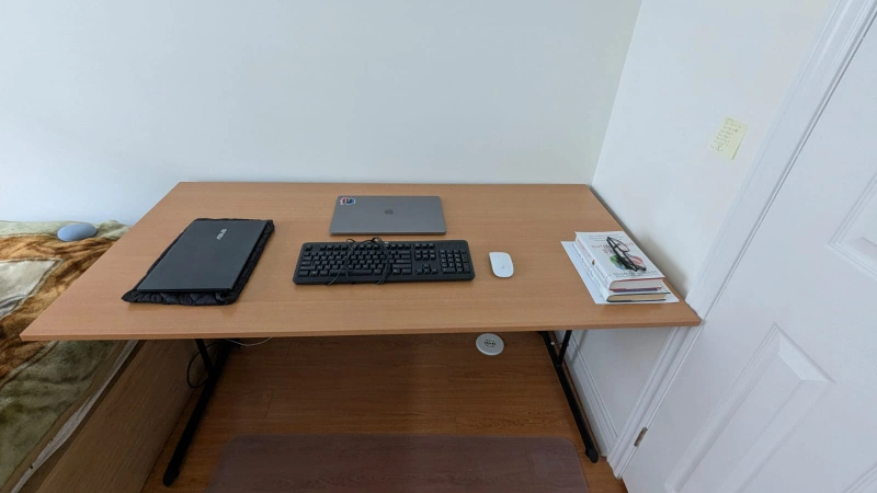 Functional computer desk. Light wood finish. Black metal legs. Ample workspace. Good condition.