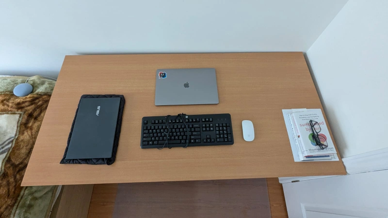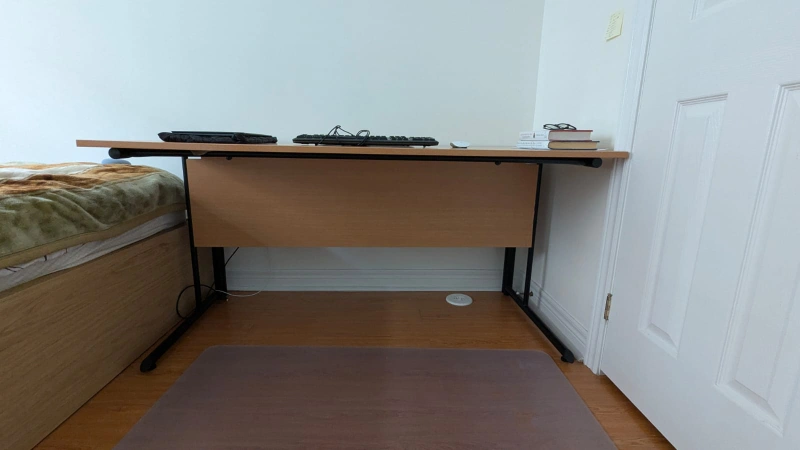 Functional computer desk. Light wood finish. Black metal legs. Ample workspace. Good condition.