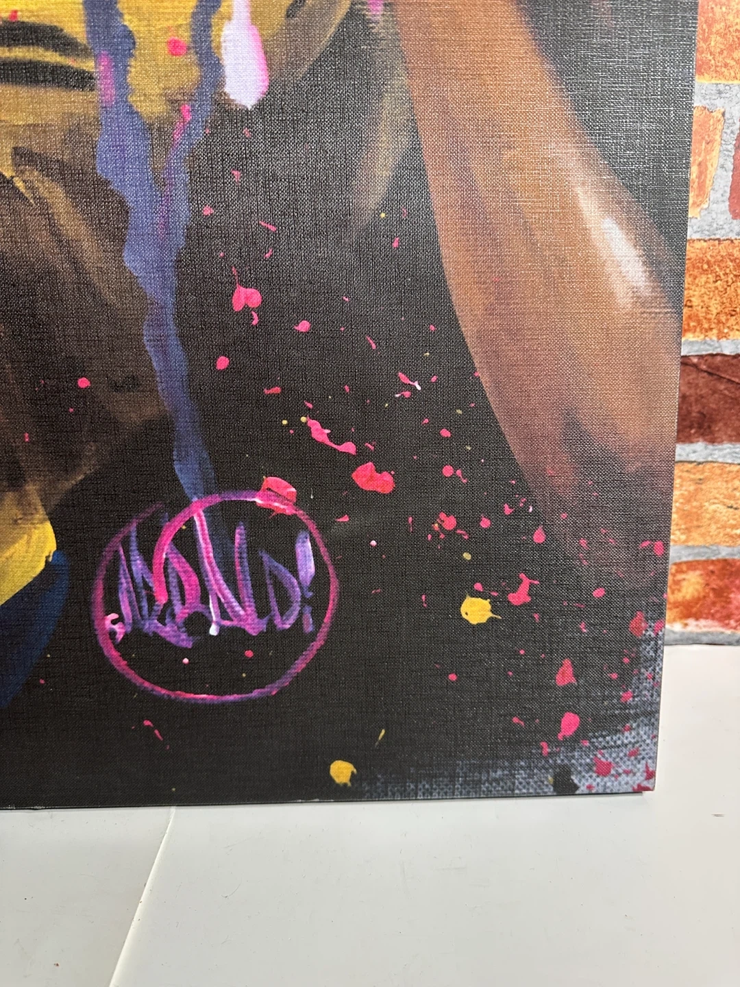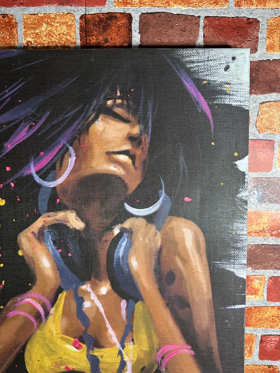 This canvas art print 36”x24” features a vibrant depiction of a woman with headphones. The artwork has a modern, energetic style with splashes of color. It's perfect for adding a pop of personality to any room.