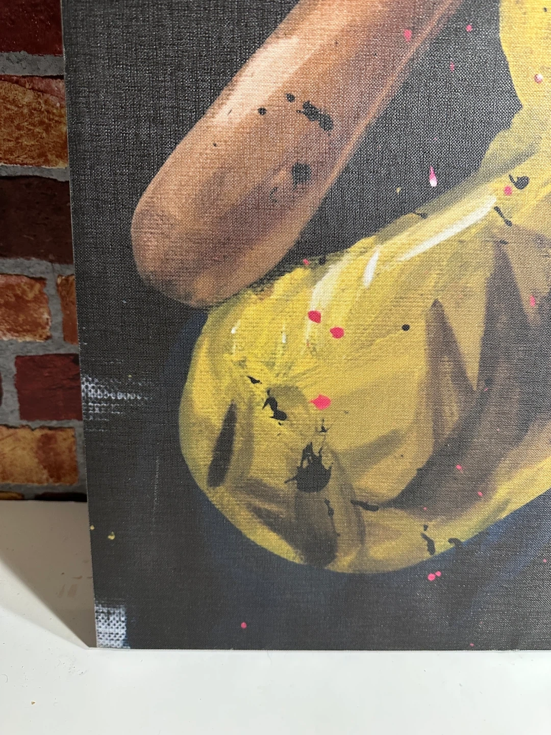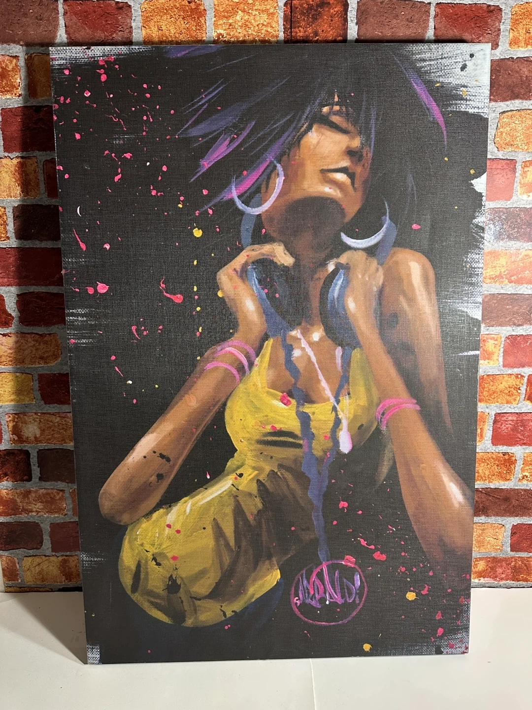 This canvas art print 36”x24” features a vibrant depiction of a woman with headphones. The artwork has a modern, energetic style with splashes of color. It's perfect for adding a pop of personality to any room.