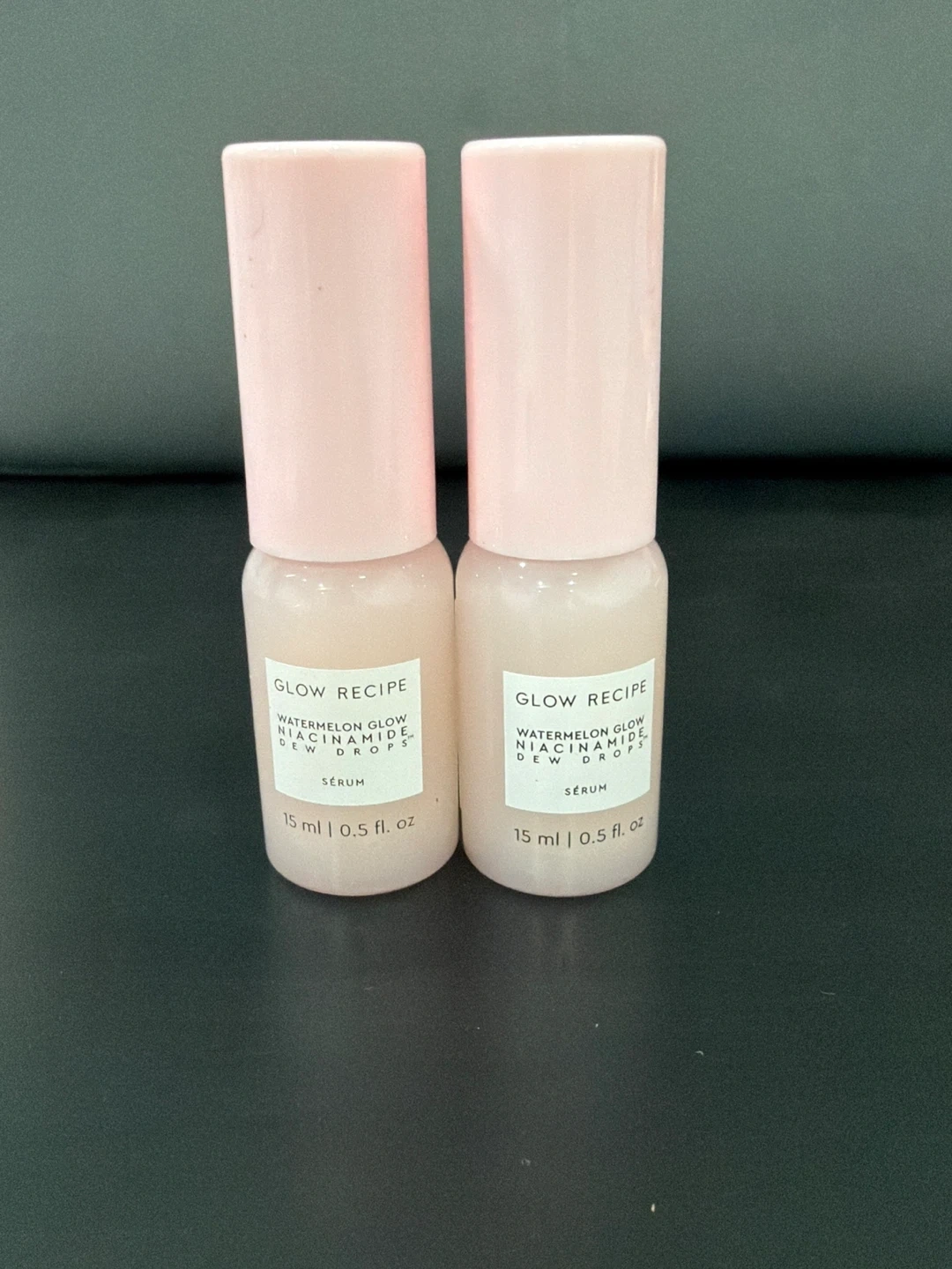 Two bottles of Glow Recipe Watermelon Glow Niacinamide Dew Drops serum are available. Each bottle contains 15 ml (0.5 fl. oz) of product. This serum is formulated with niacinamide. It's great for adding a dewy glow to your skin!