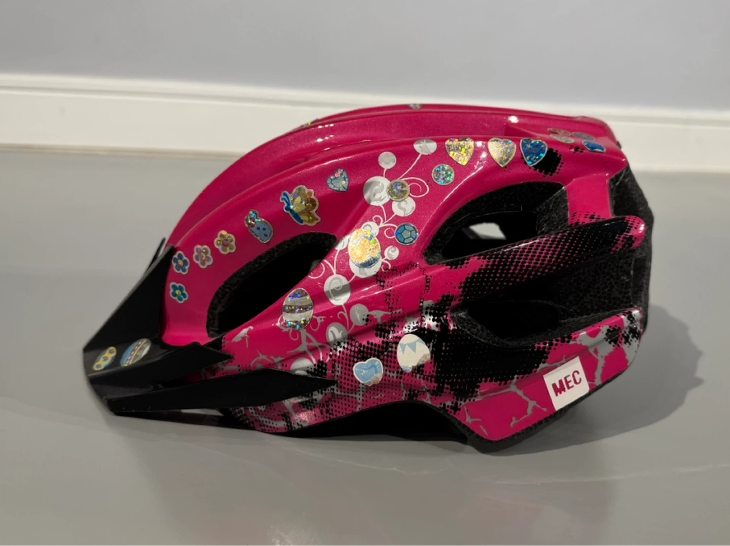 Pink and black lightweight children’s bike helmet in great structural condition. Fits most kids aged 4–8 depending on head size.