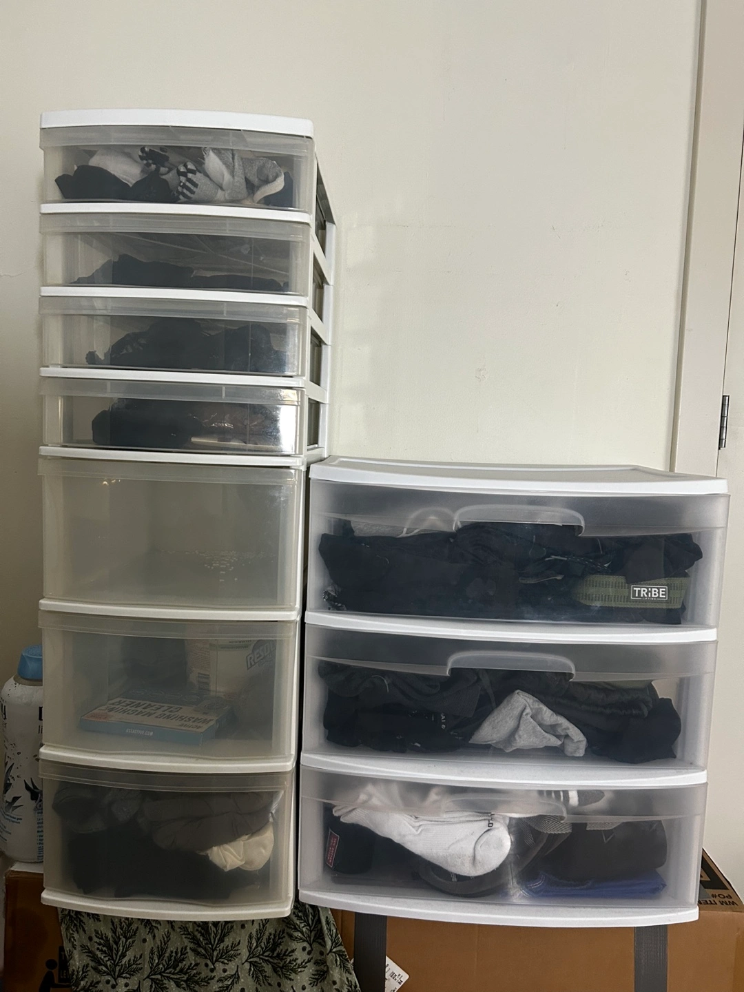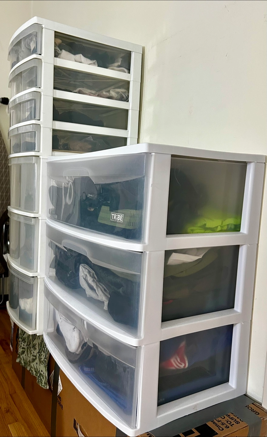 White plastic storage drawer units. Perfect for organizing clothes, accessories, or anything else you need to keep tidy. Great for small spaces or adding extra storage to any room