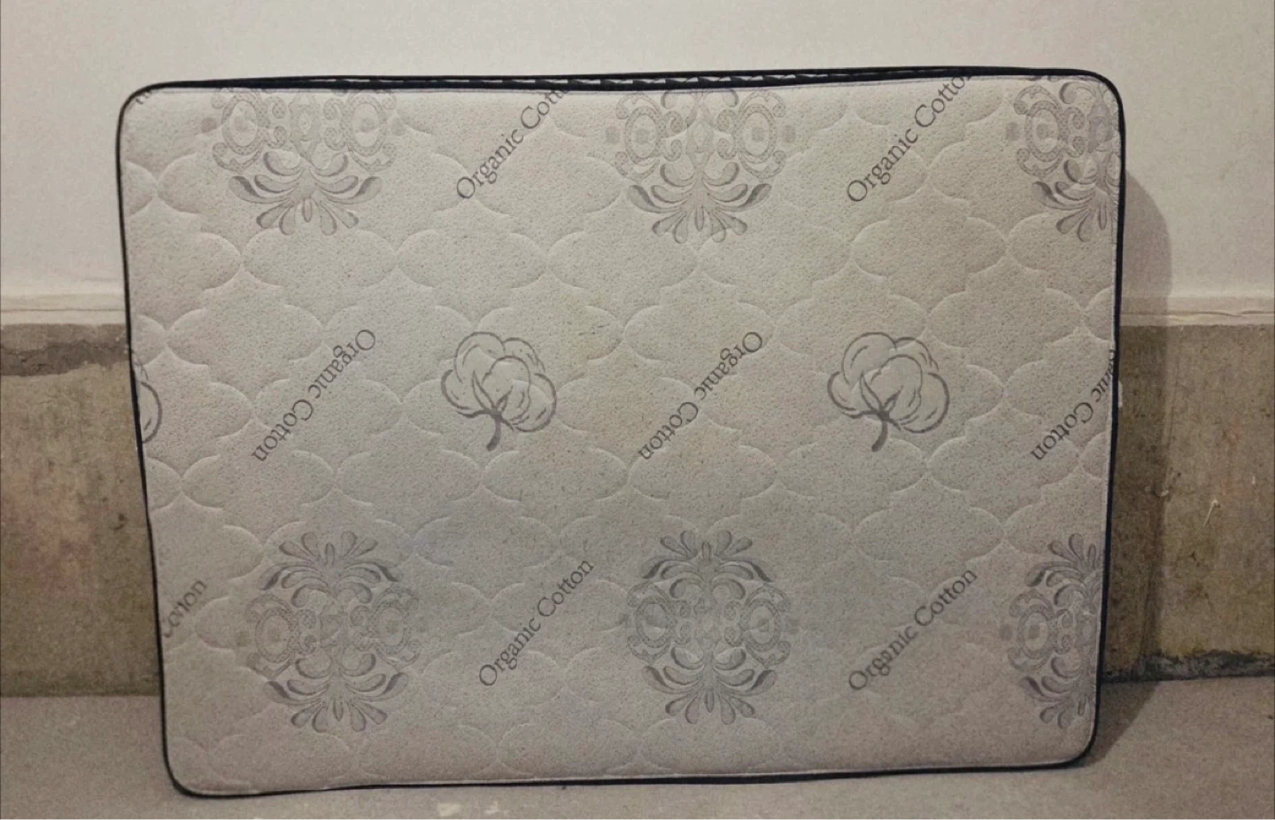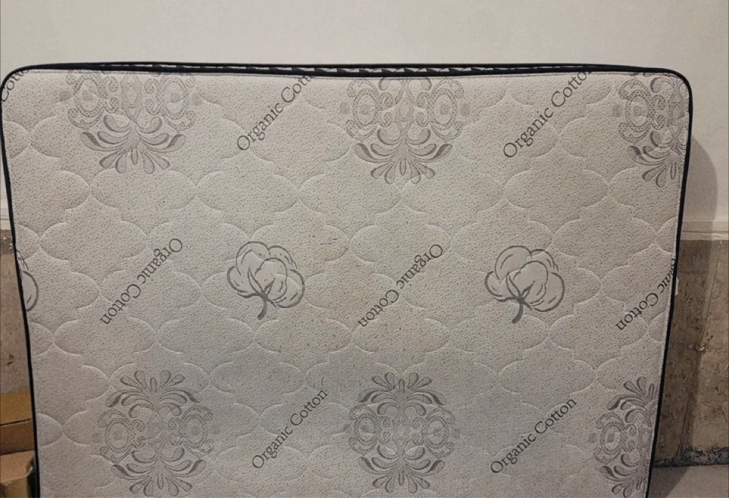 This is a mattress topper made with organic cotton. It features a soft, quilted surface with a repeating pattern of cotton blossoms and ornate designs. The edges are finished with a black trim. It's a comfortable addition to any bed.