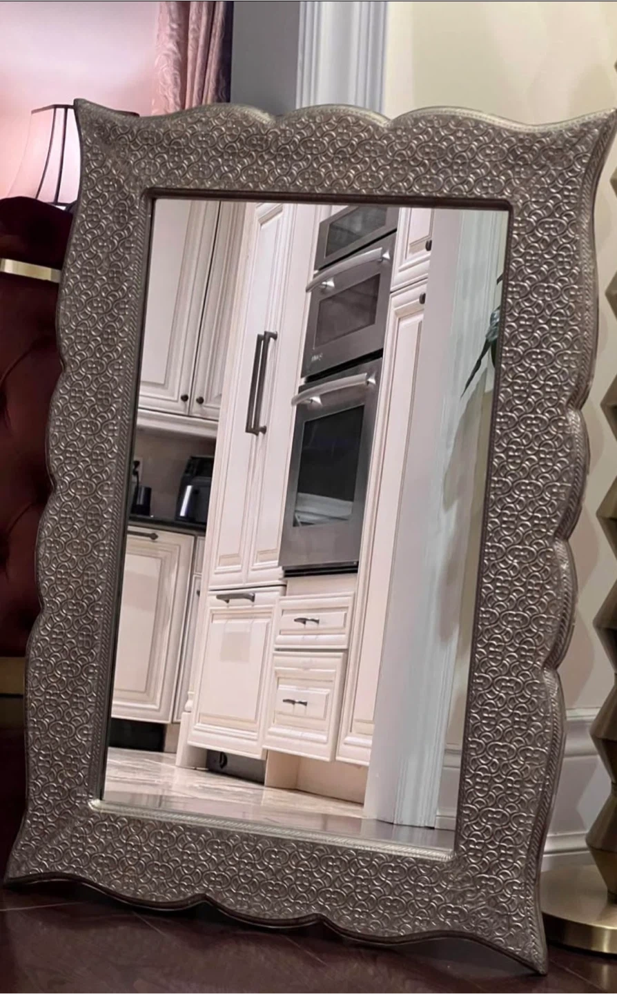 This Gurenstein Home decorative mirror features an intricate embossed frame. Wipe clean only. Mounting hardware is not included.