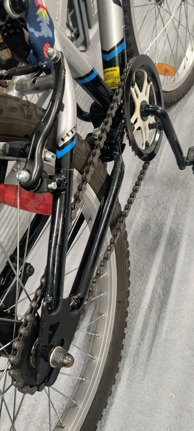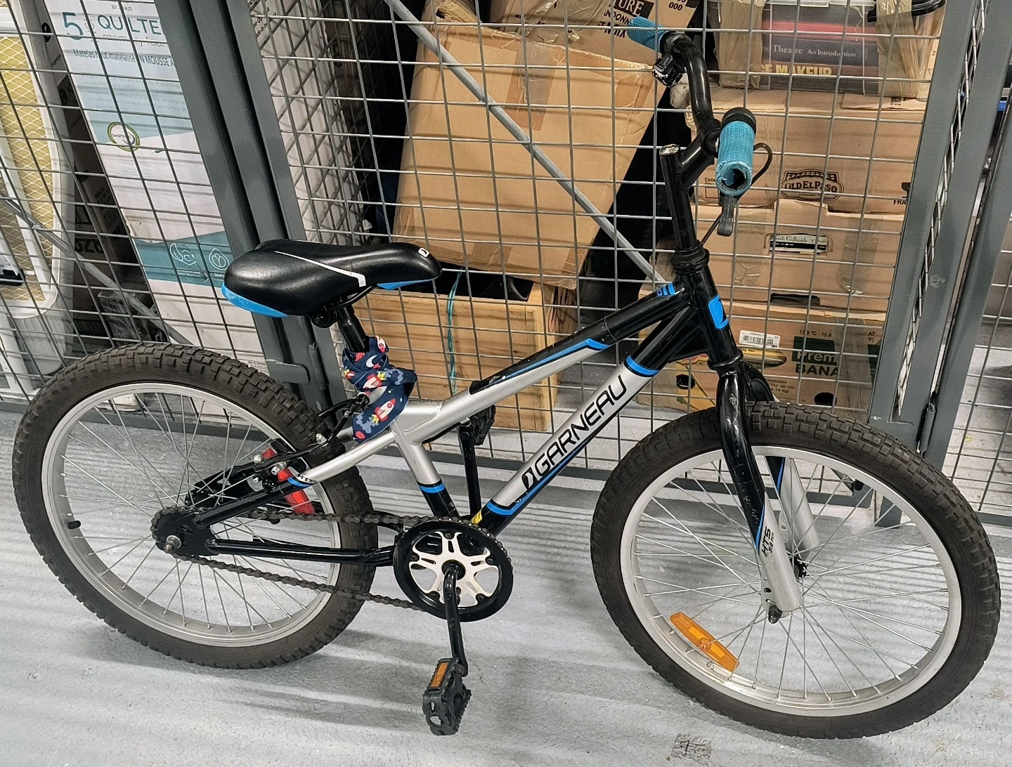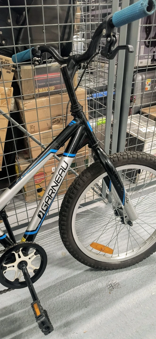 Garneau Junior Bicycle HTS (High-Tensile Steel) with blue handlebars and seat accents. It's suitable for younger riders. This bike has a sturdy frame and reliable braking.