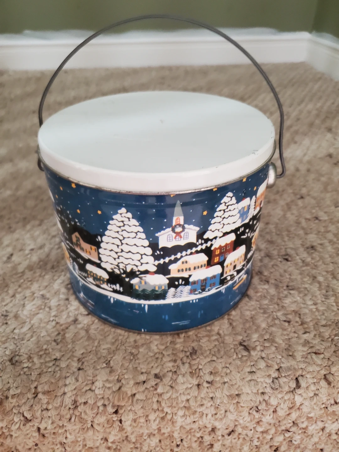 A decorative tin pail featuring a charming winter village scene. It has a metal handle for easy carrying. This pail is perfect for holiday treats or small seasonal decorations.