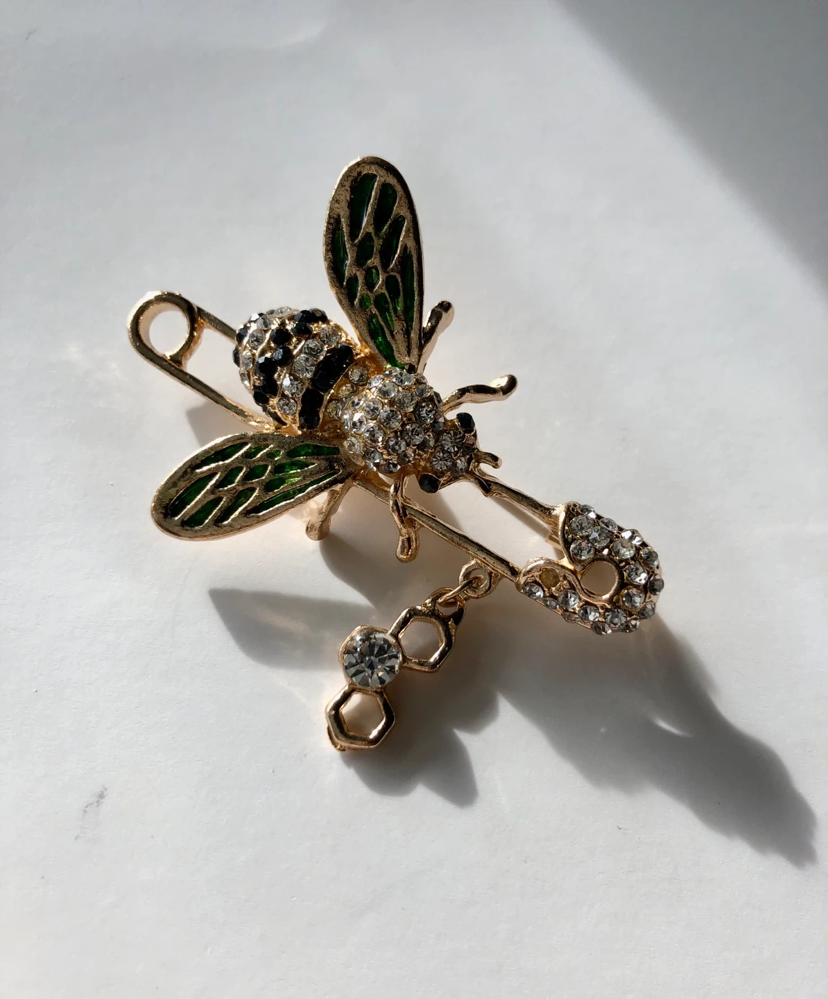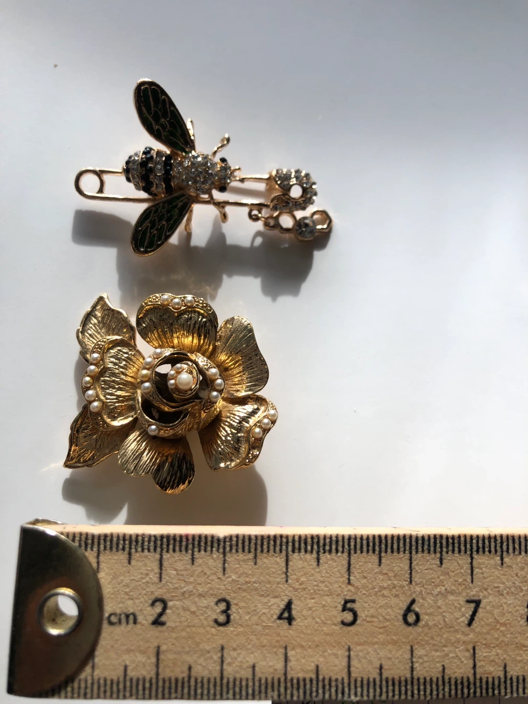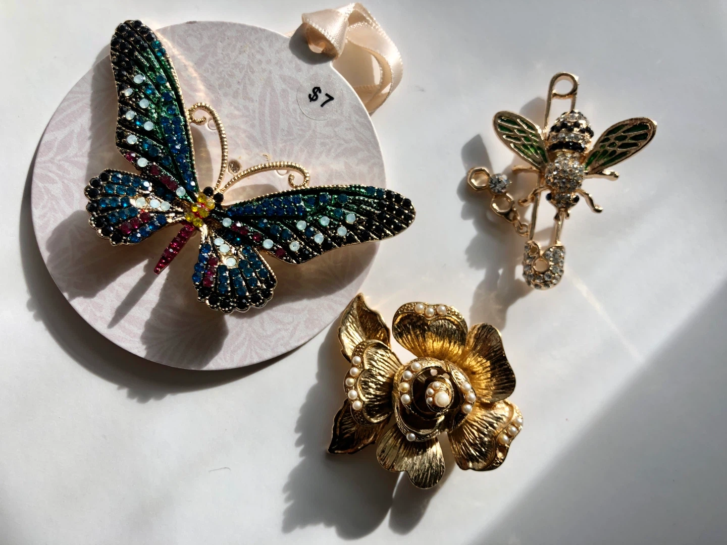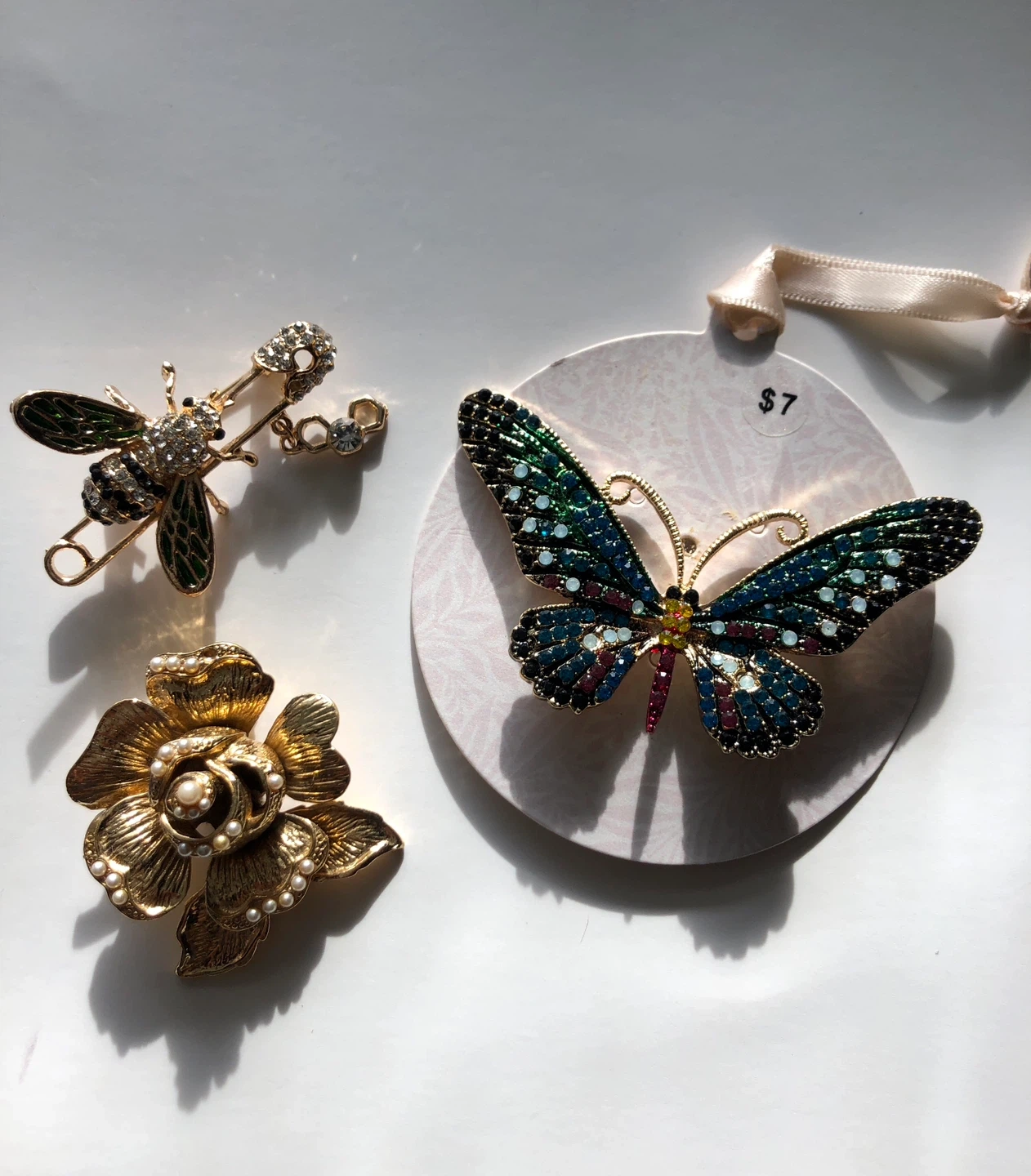 Selling a collection of cute brooches! There's a butterfly brooch with colourful rhinestones, a bee brooch with a dangling honeycomb charm, and a gold flower brooch with pearl accents. They're all in great condition and ready to add some sparkle to your outfits!