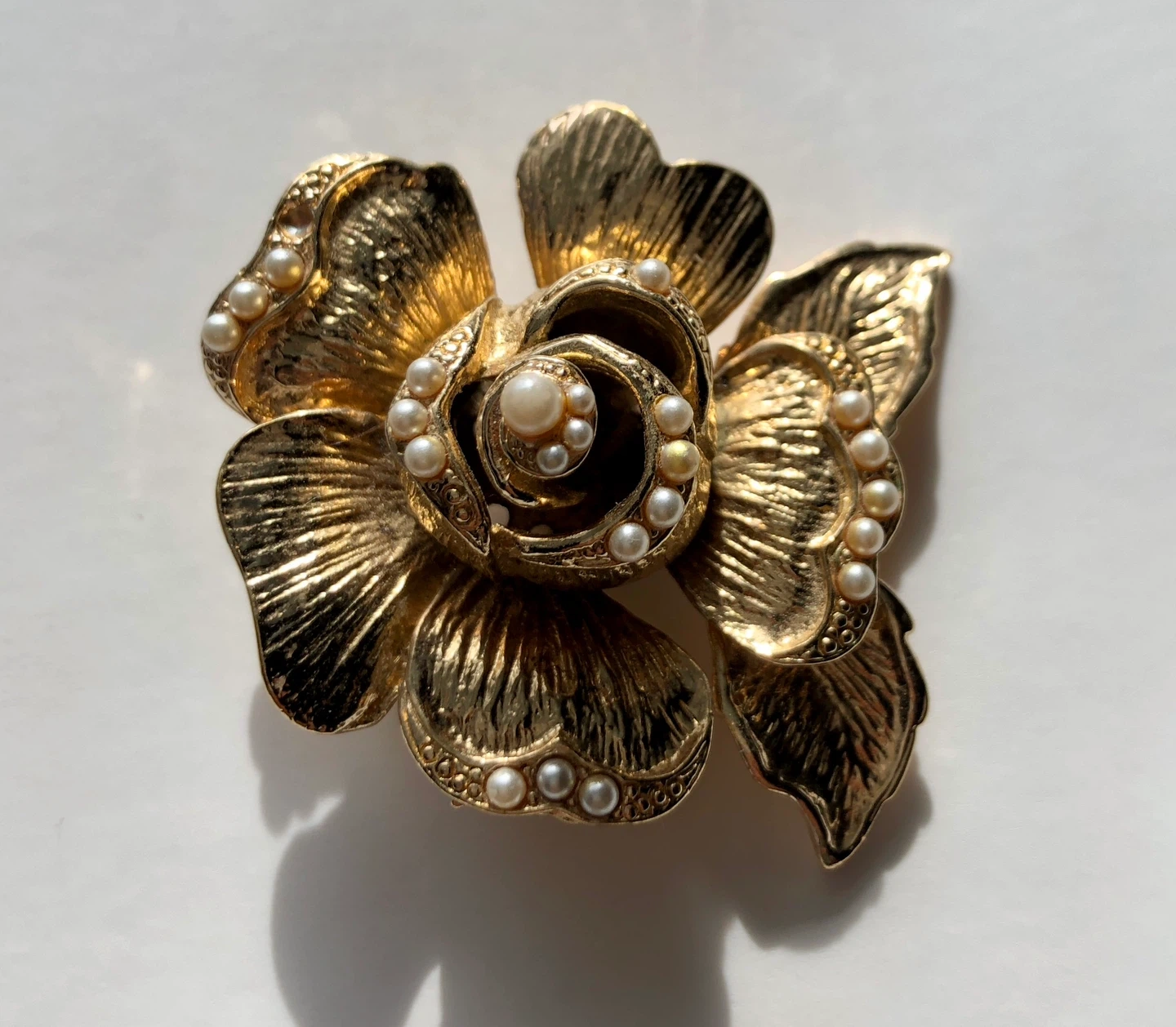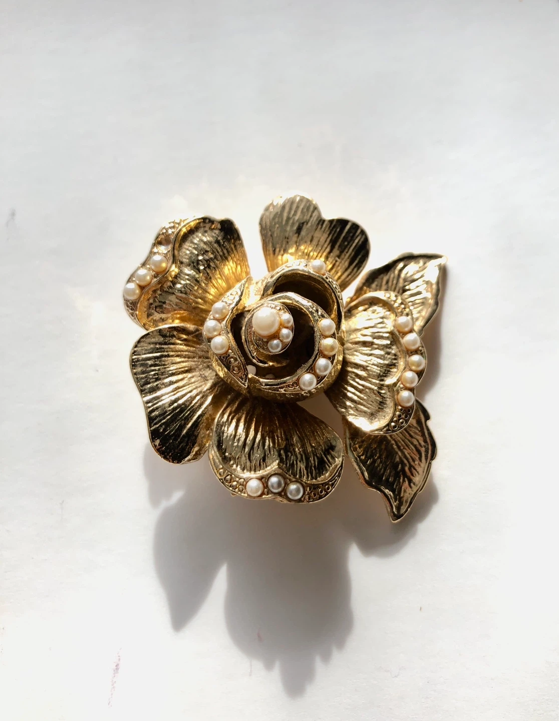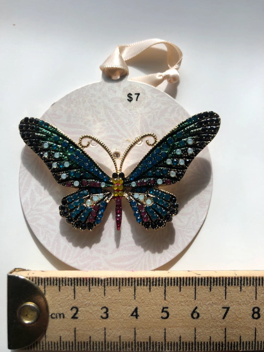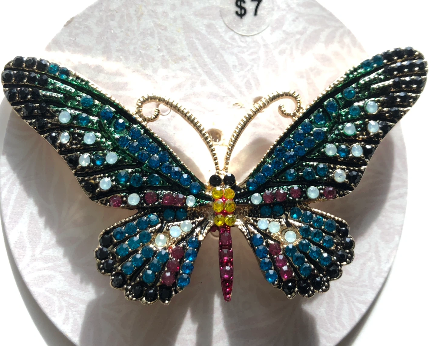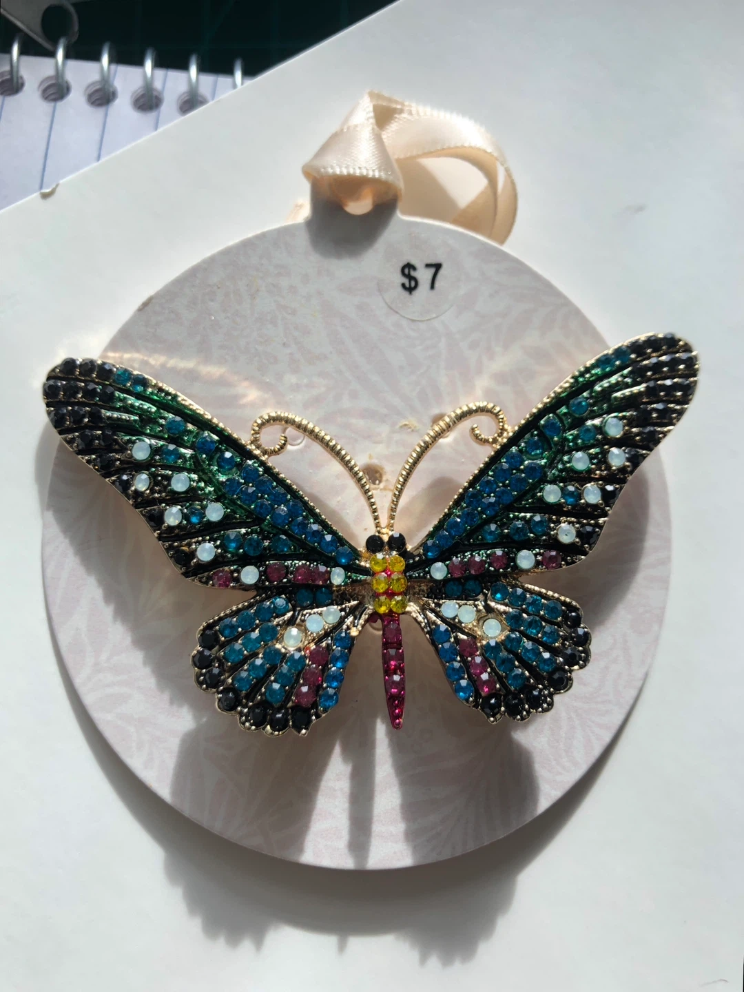 Selling a collection of cute brooches! There's a butterfly brooch with colourful rhinestones, a bee brooch with a dangling honeycomb charm, and a gold flower brooch with pearl accents. They're all in great condition and ready to add some sparkle to your outfits!