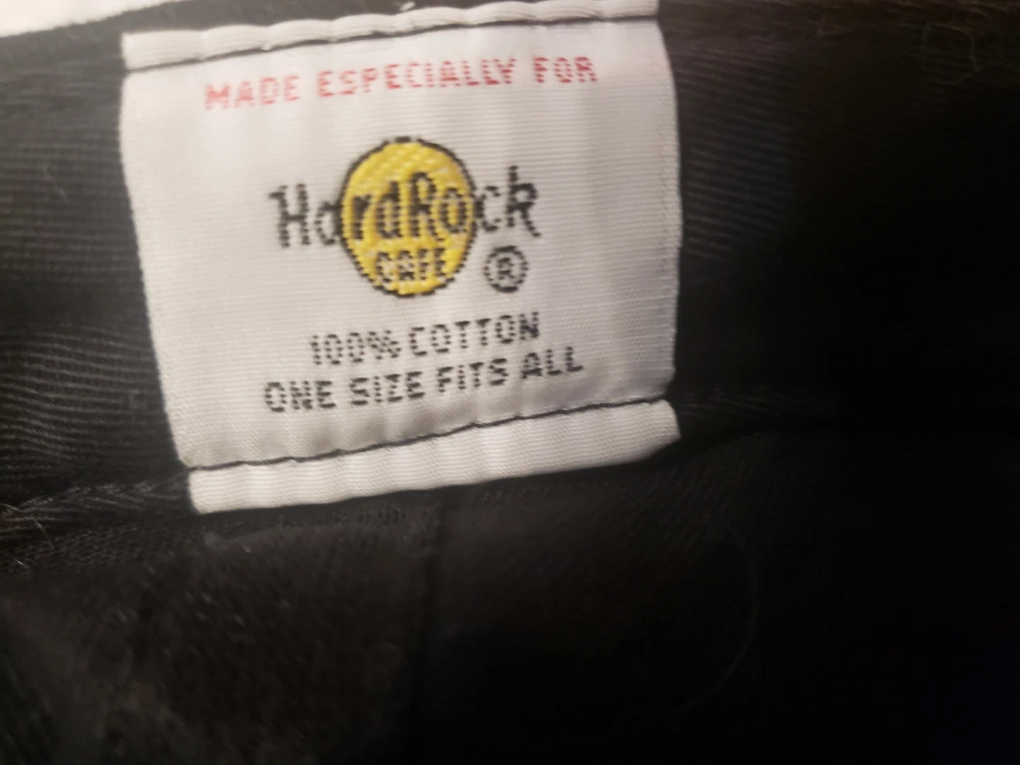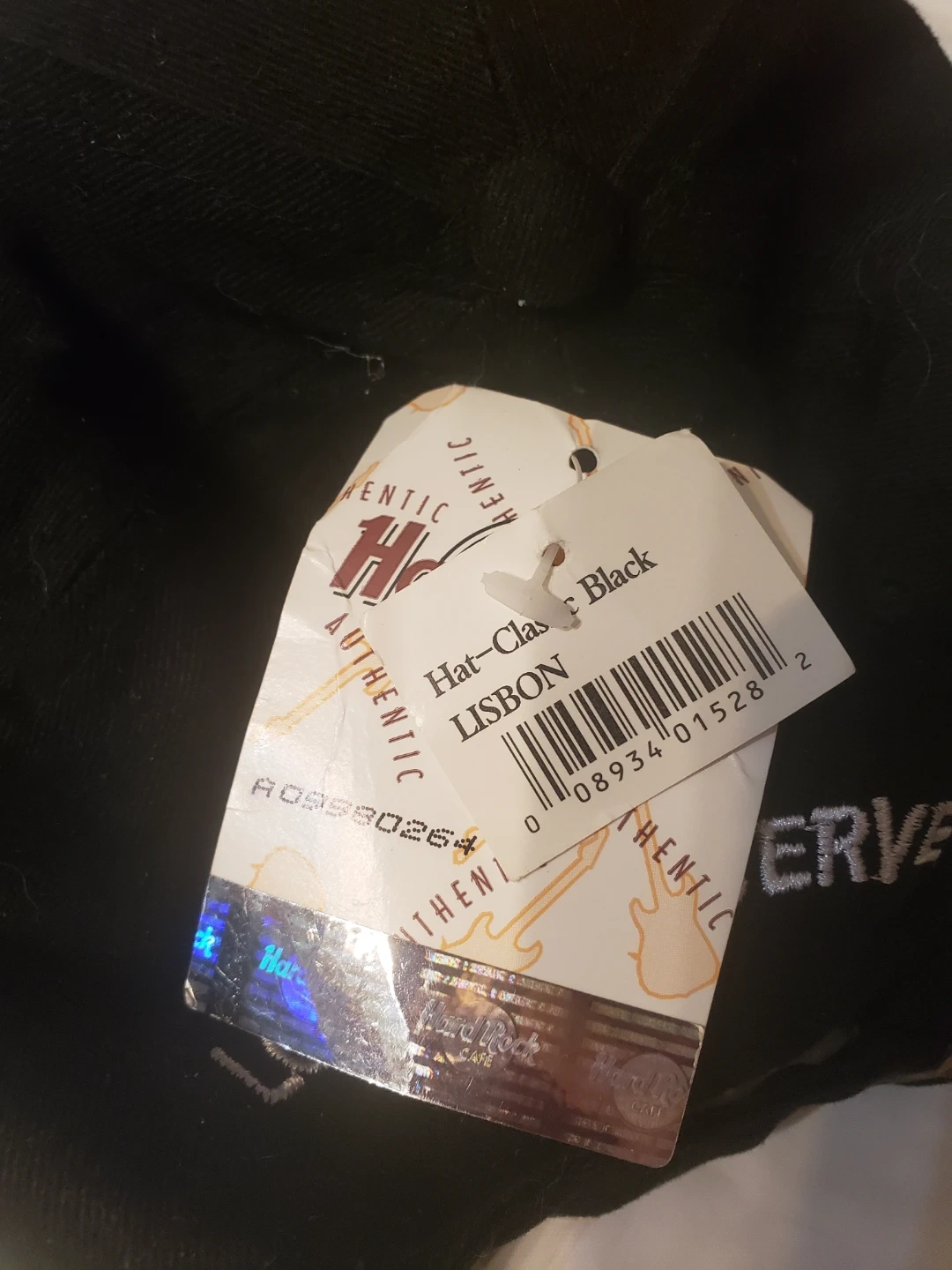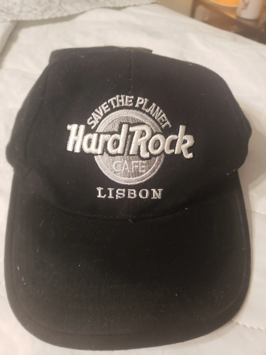 This is a black Hard Rock Cafe baseball cap from Lisbon. It features "Save the Planet" and "Love All Serve All" embroidery. It's a classic style cap.
