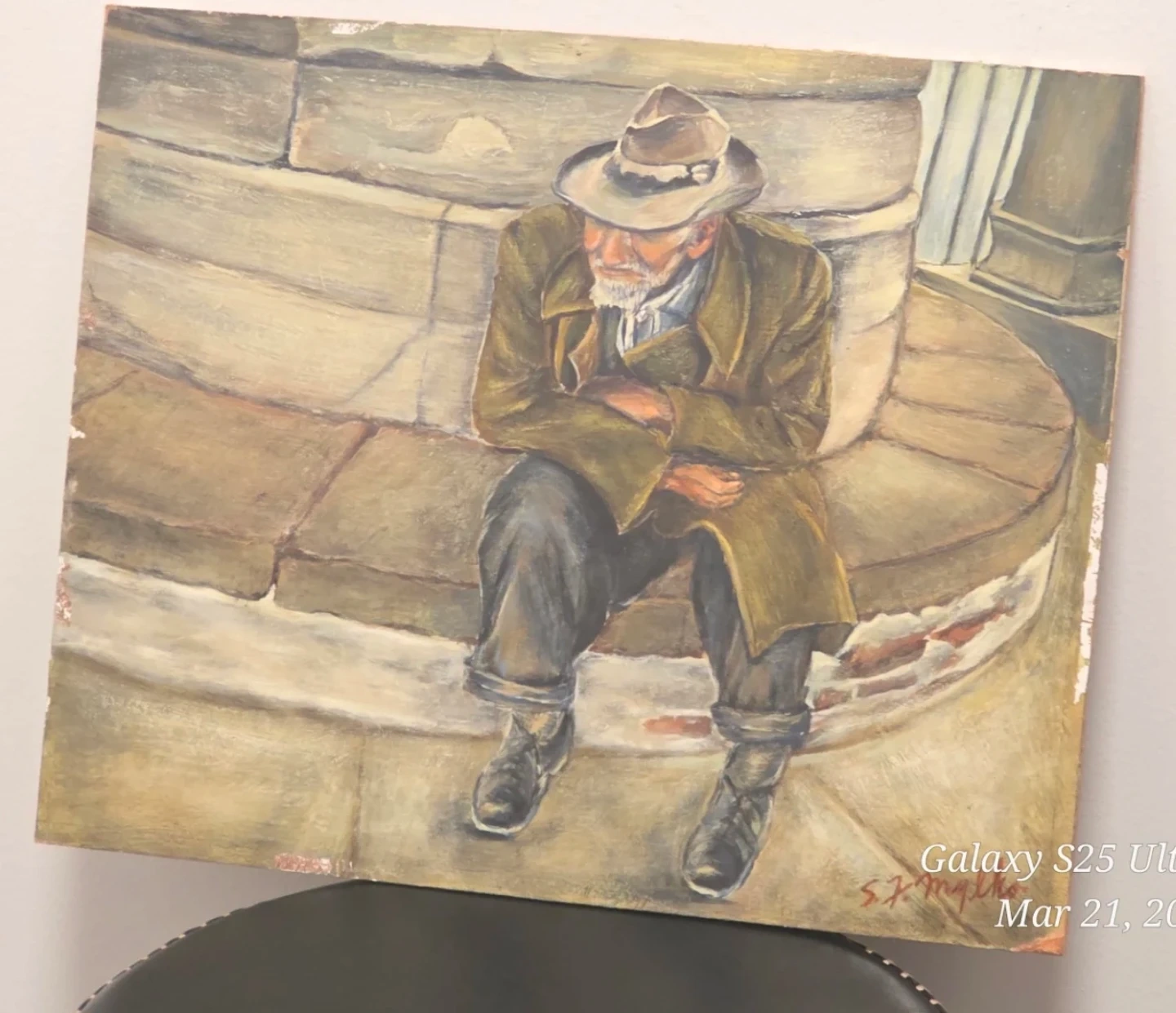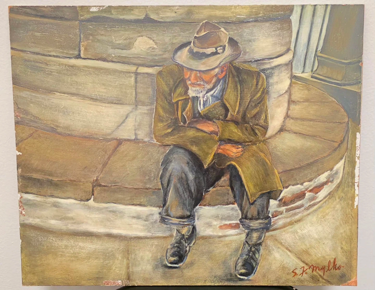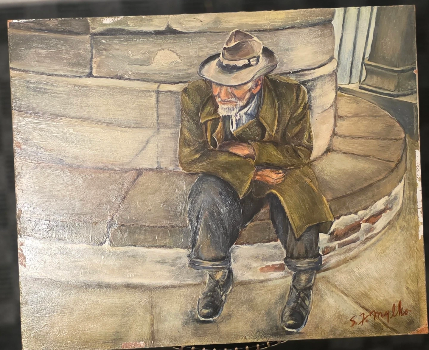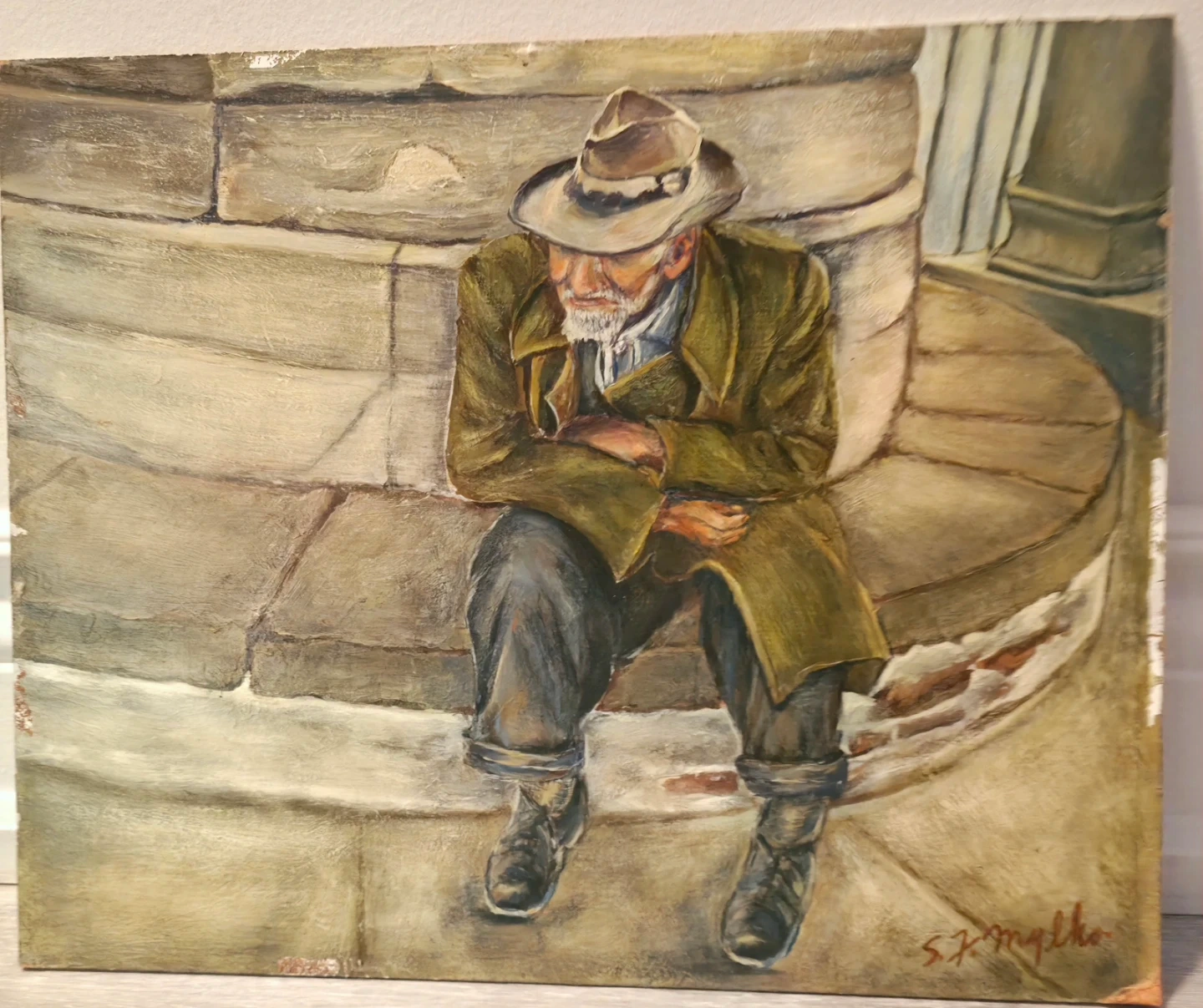 °°°Delve into the rich tapestry of history and culture with "Vintage Hand Painted, Oil On Canvas, "Post-Battlefield Scars," a poignant piece by S.F. Mylko.