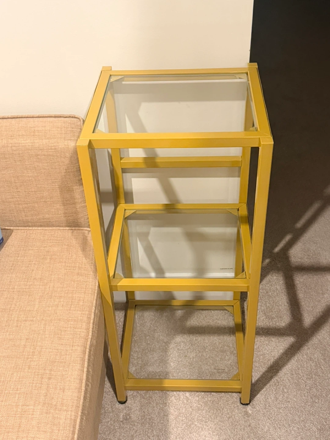 Yellow Metal and Glass 3-Shelf Side Table