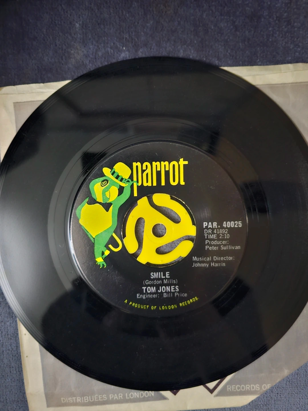 This is a 7-inch vinyl single featuring Tom Jones singing "Smile" and "Delilah". It's a product of London Records, released on the Parrot label. The record comes in its original paper sleeve.