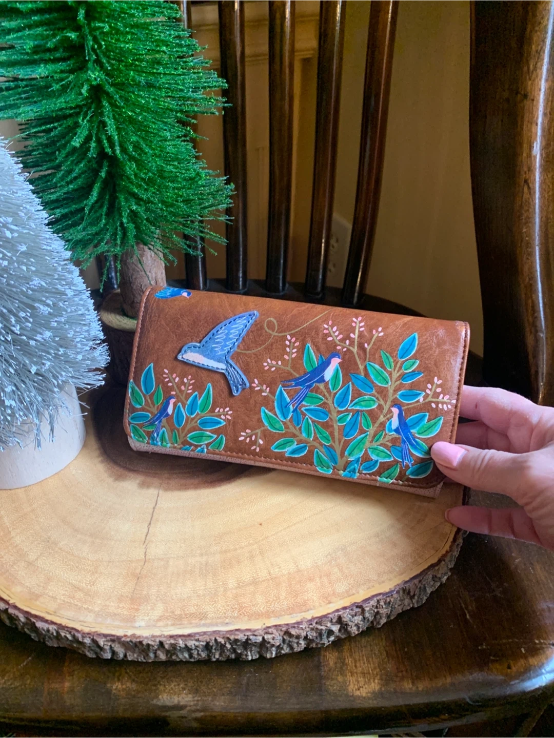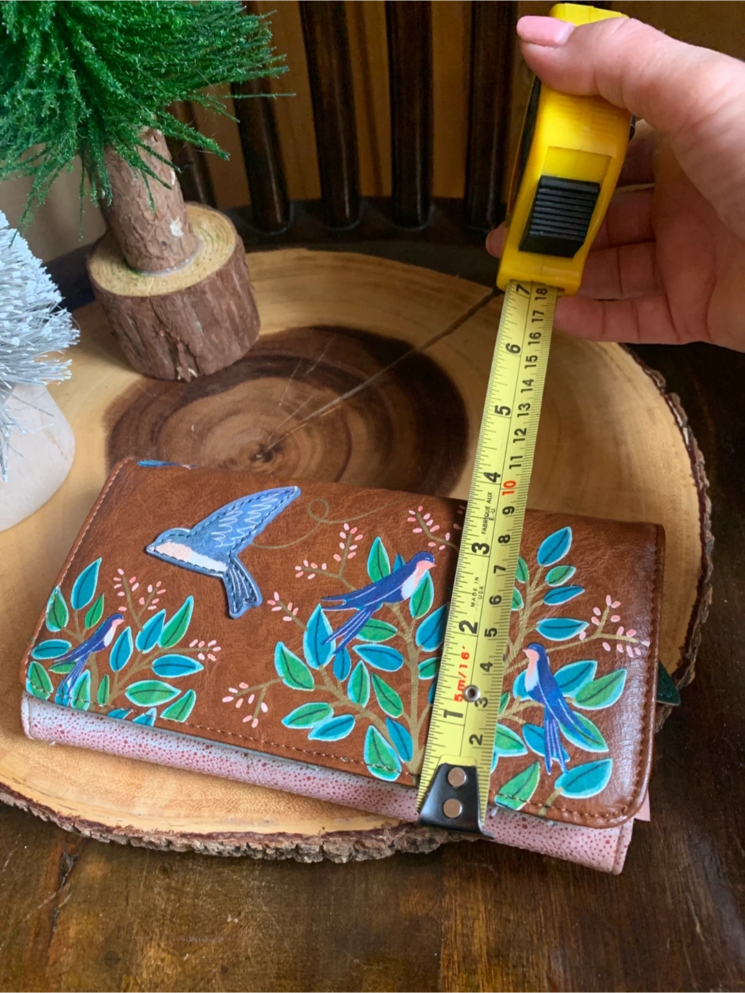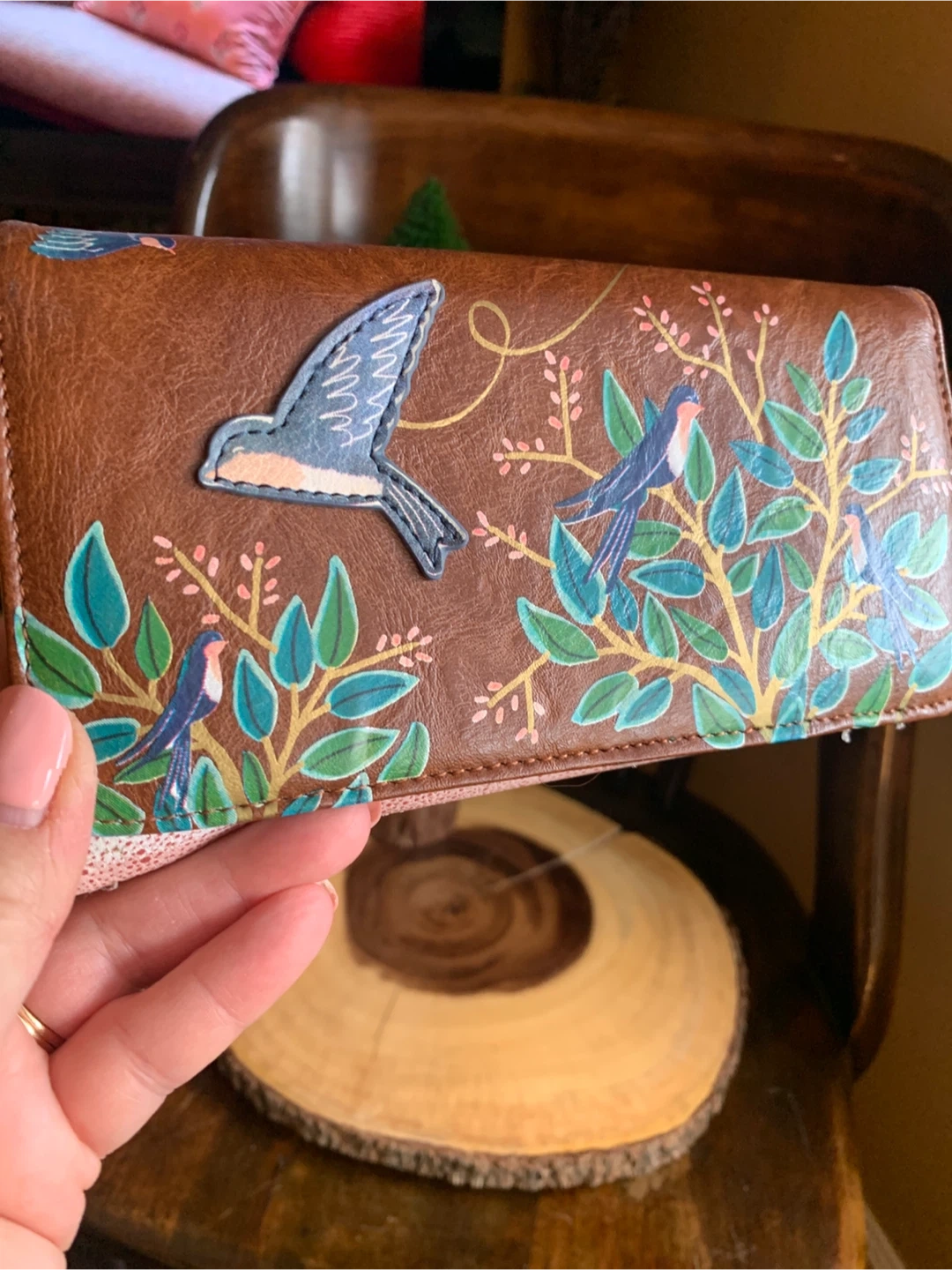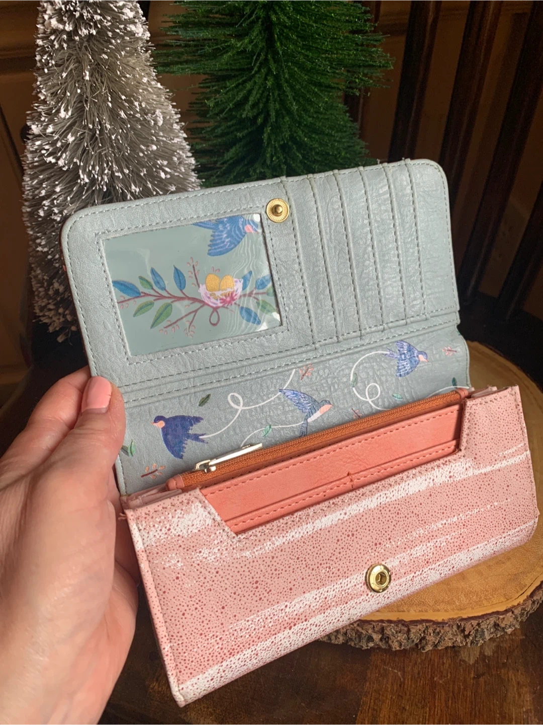 Lovely House of Disaster wallet entitled, Secret Garden, with a swallow bird and floral design. It is faux leather but feels very nice and soft. It has multiple card slots and a zip pocket on the inside and back flap. Interior is a bright coral and has a bird/leaf design. It literally looks brand new and unused ever! Great functional accessory for your spring or summer purse!