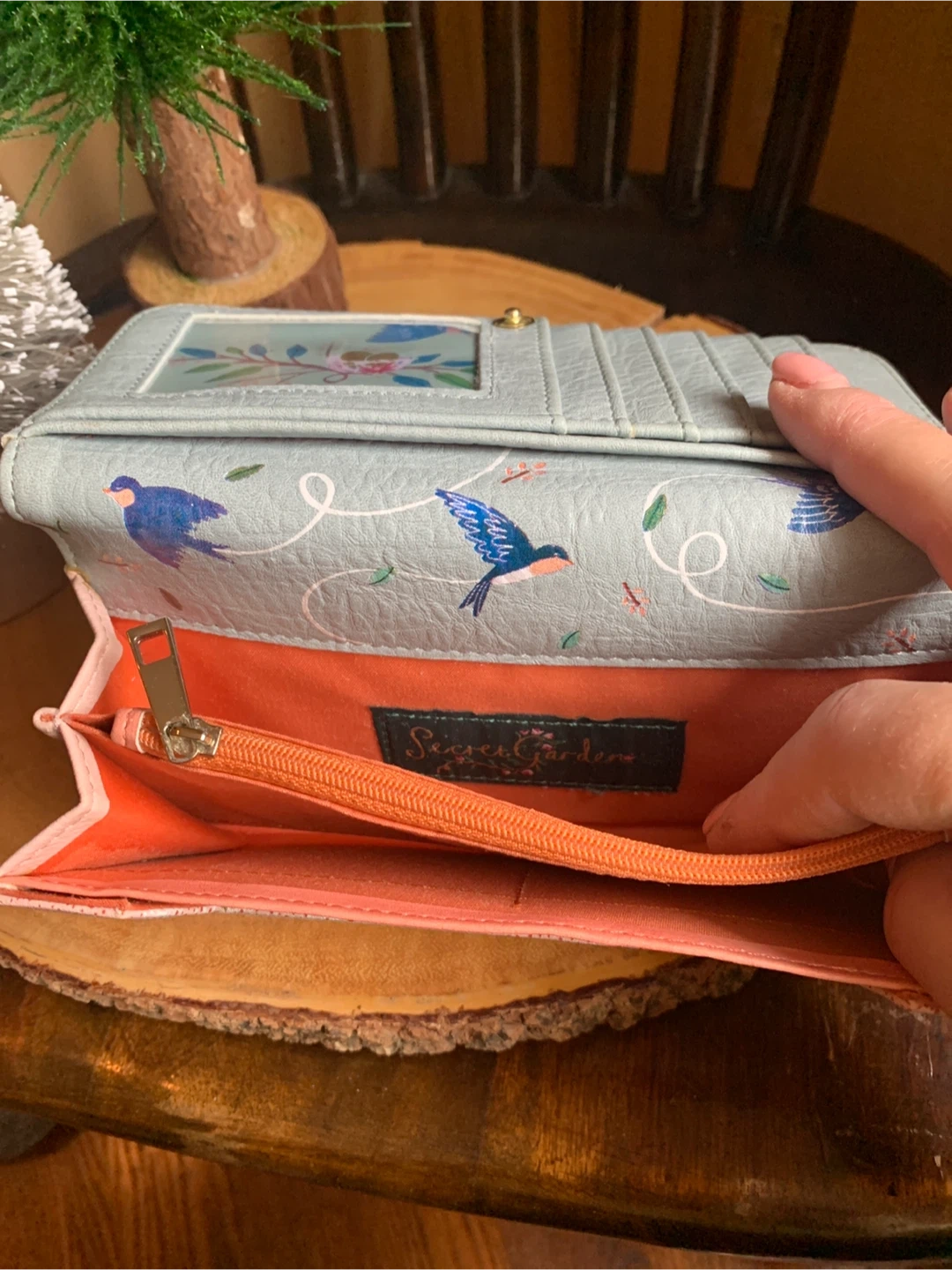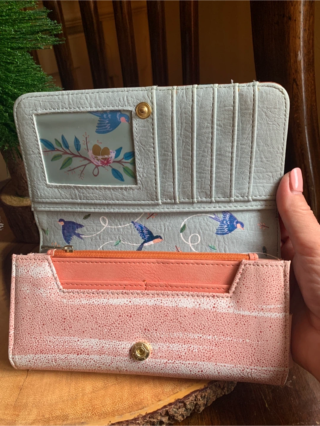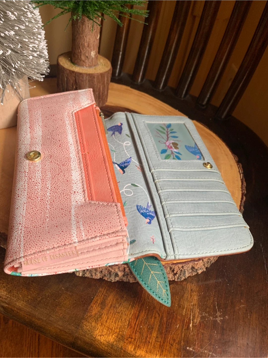 Lovely House of Disaster wallet entitled, Secret Garden, with a swallow bird and floral design. It is faux leather but feels very nice and soft. It has multiple card slots and a zip pocket on the inside and back flap. Interior is a bright coral and has a bird/leaf design. It literally looks brand new and unused ever! Great functional accessory for your spring or summer purse!