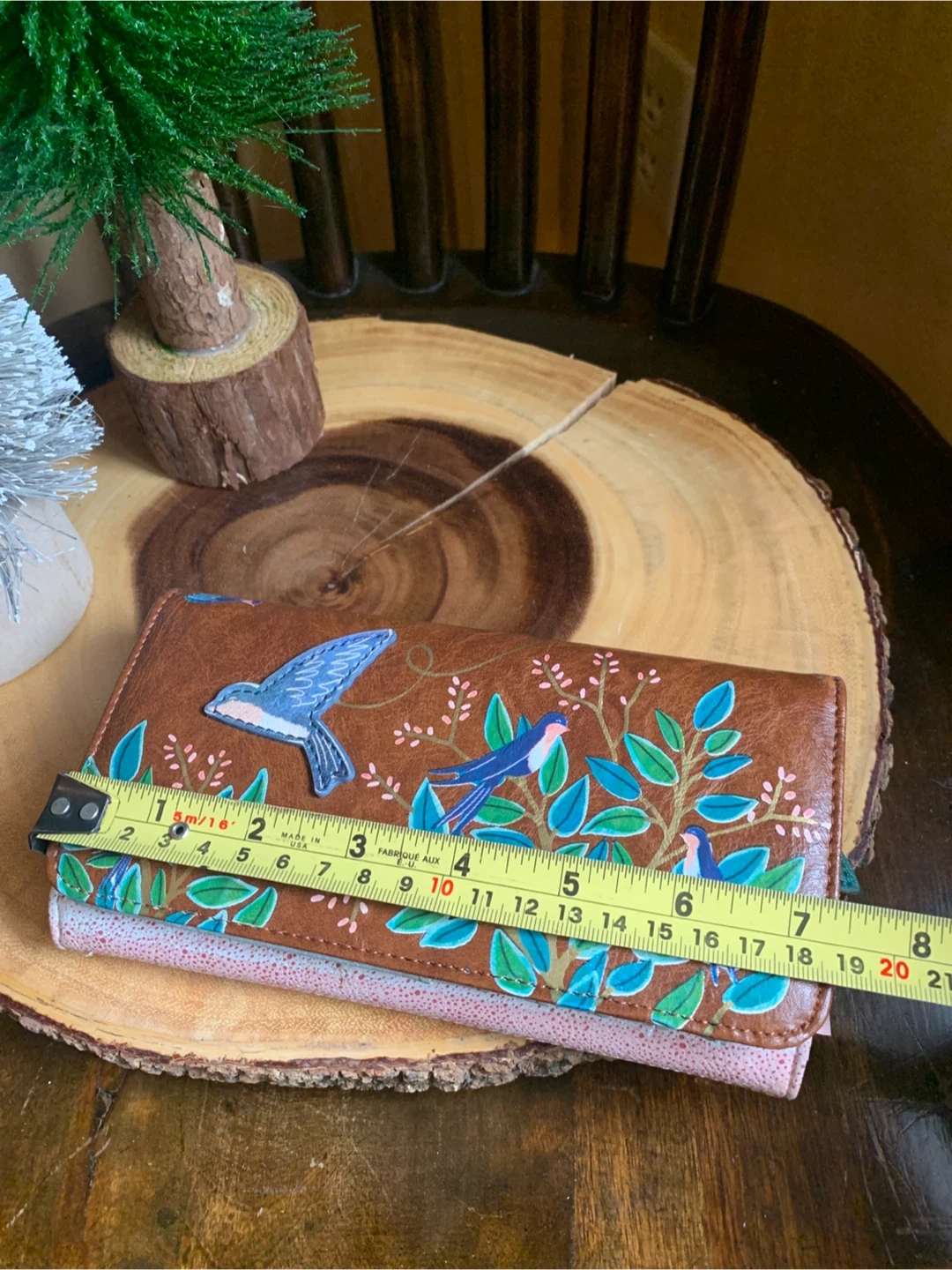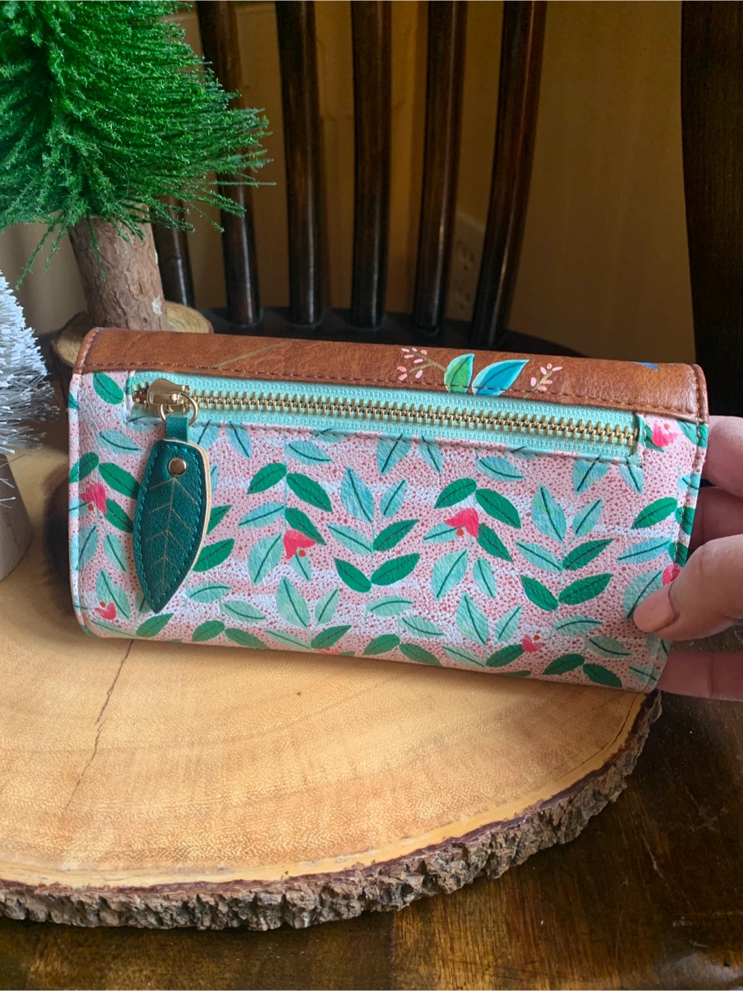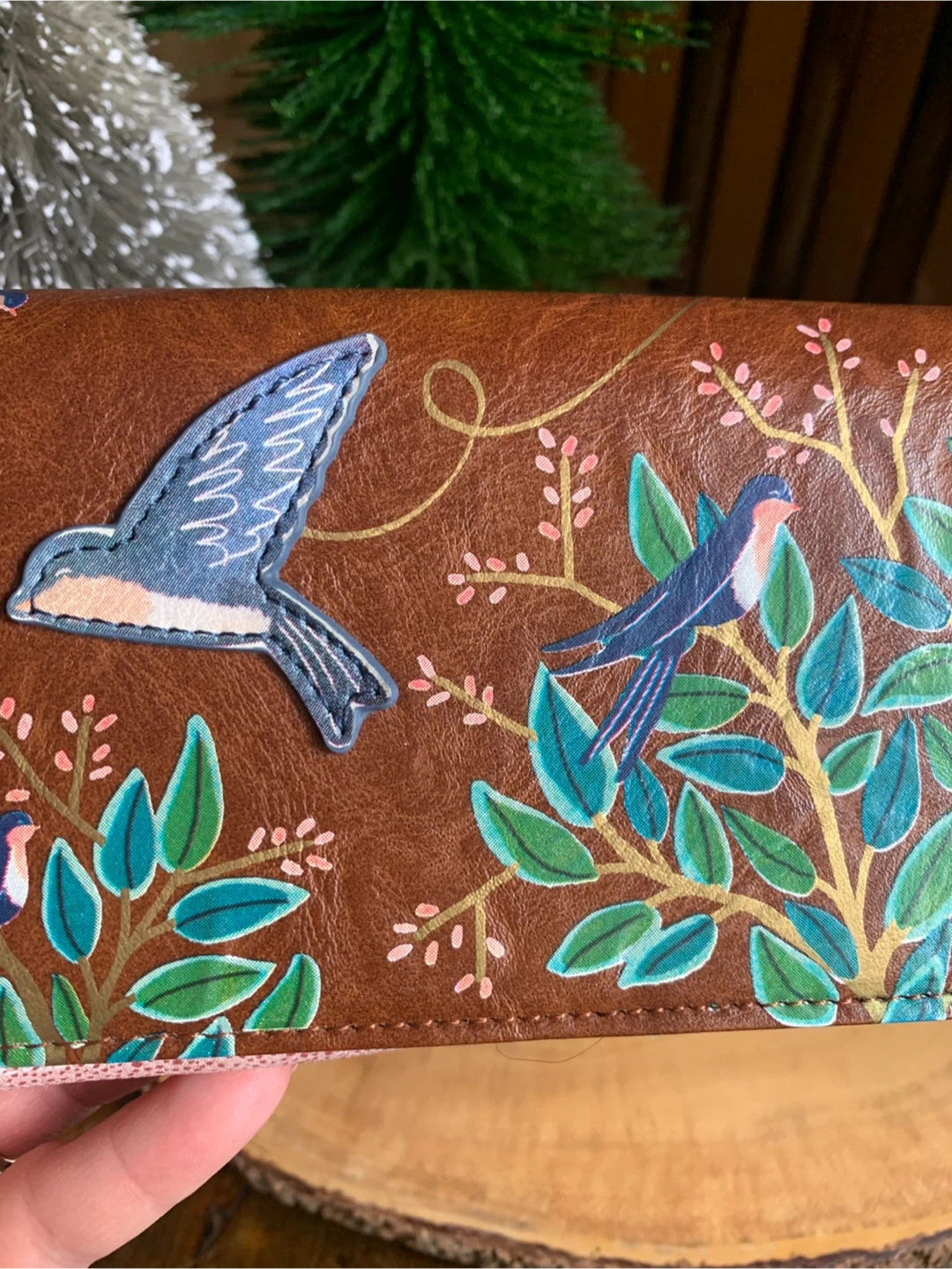 Lovely House of Disaster wallet entitled, Secret Garden, with a swallow bird and floral design. It is faux leather but feels very nice and soft. It has multiple card slots and a zip pocket on the inside and back flap. Interior is a bright coral and has a bird/leaf design. It literally looks brand new and unused ever! Great functional accessory for your spring or summer purse!