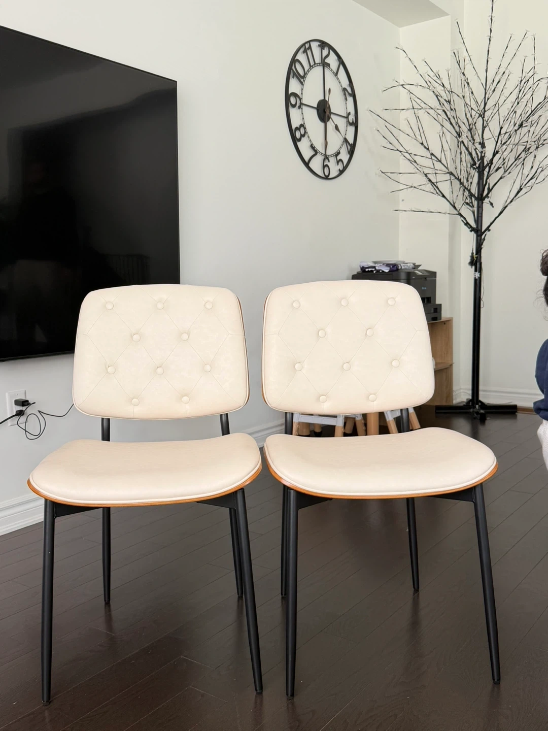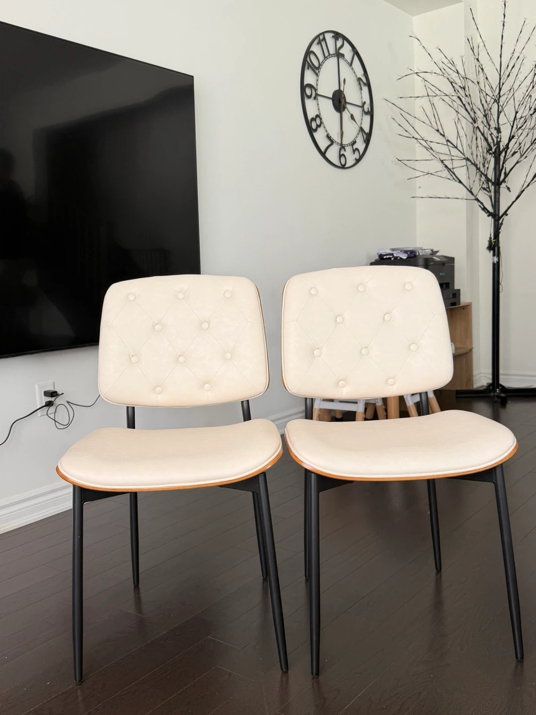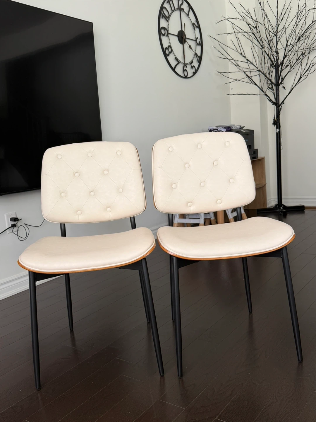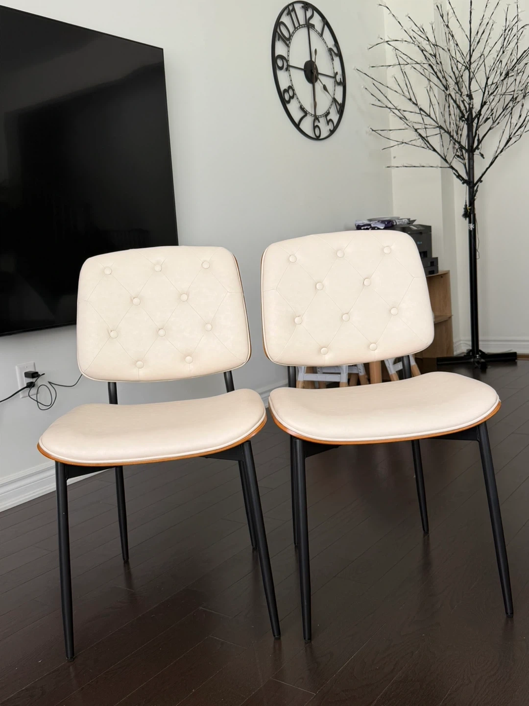 Selling a pair of cream upholstered dining chairs. They feature a tufted backrest and a wooden trim on the seat. The legs are black metal.
