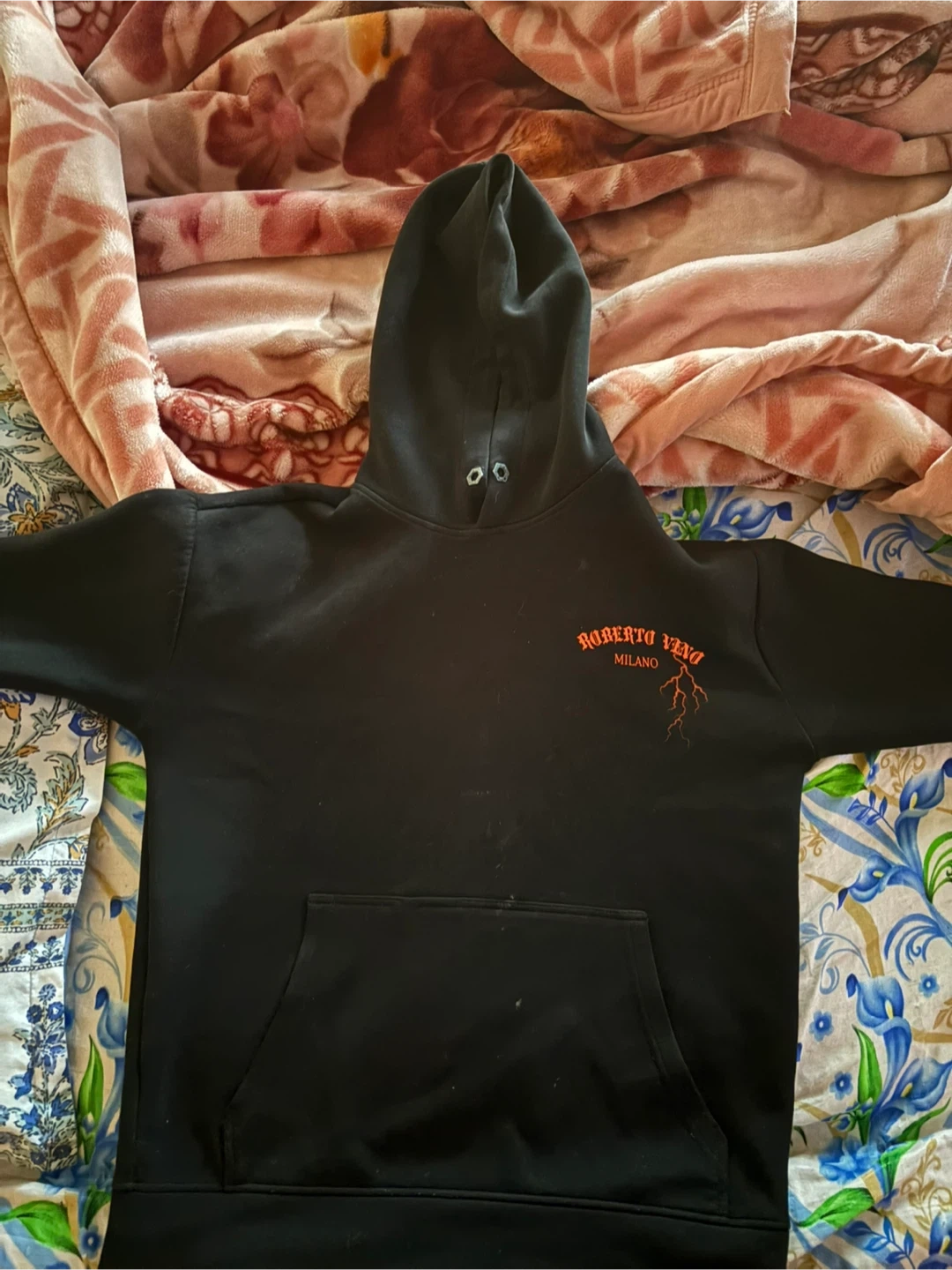 Selling a Roberto Vino Milano hoodie in black, size small. The hoodie features a unique design on the back with the text "ROBERTO VINO" in orange lettering, along with "MILANO" and other text details. A cool and stylish piece!