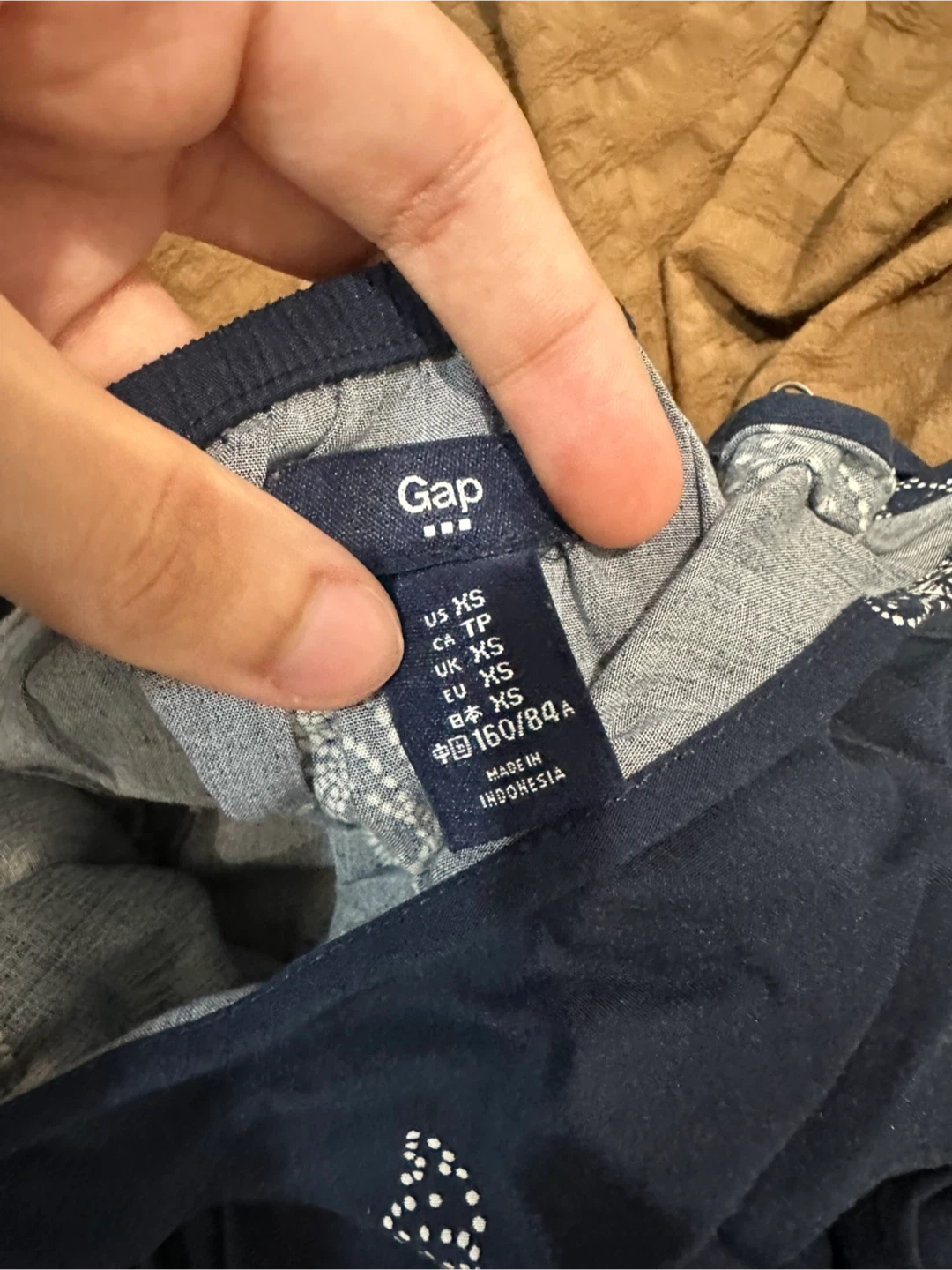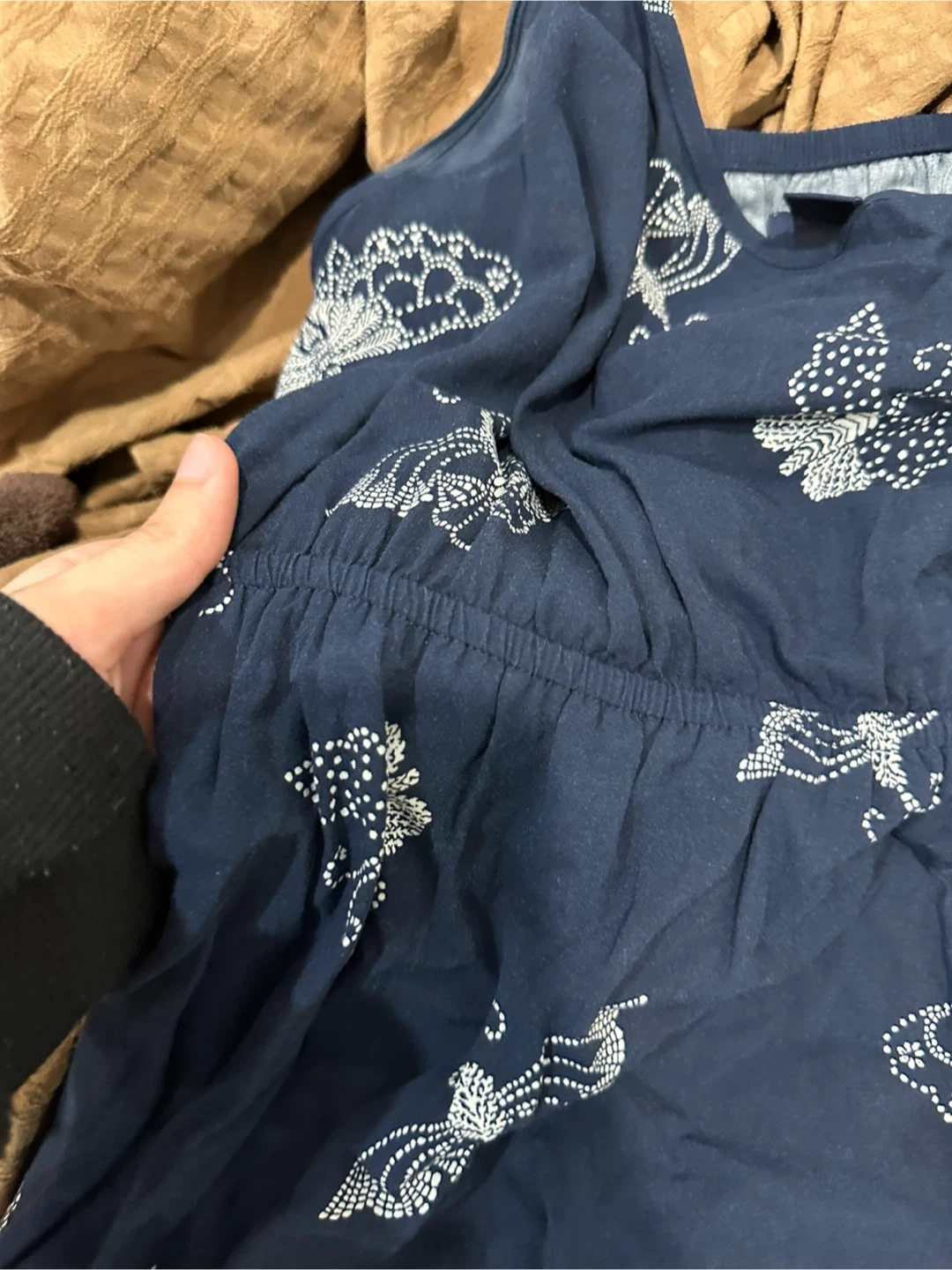 A lovely navy blue dress with a white butterfly print. It features adjustable spaghetti straps and an elasticized empire waist. Made from lightweight fabric, it's perfect for warmer weather!