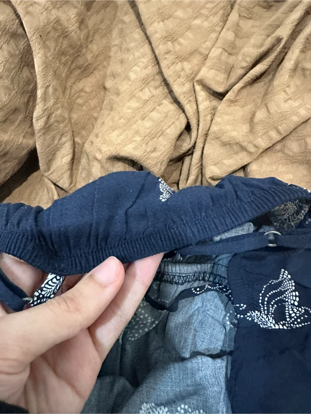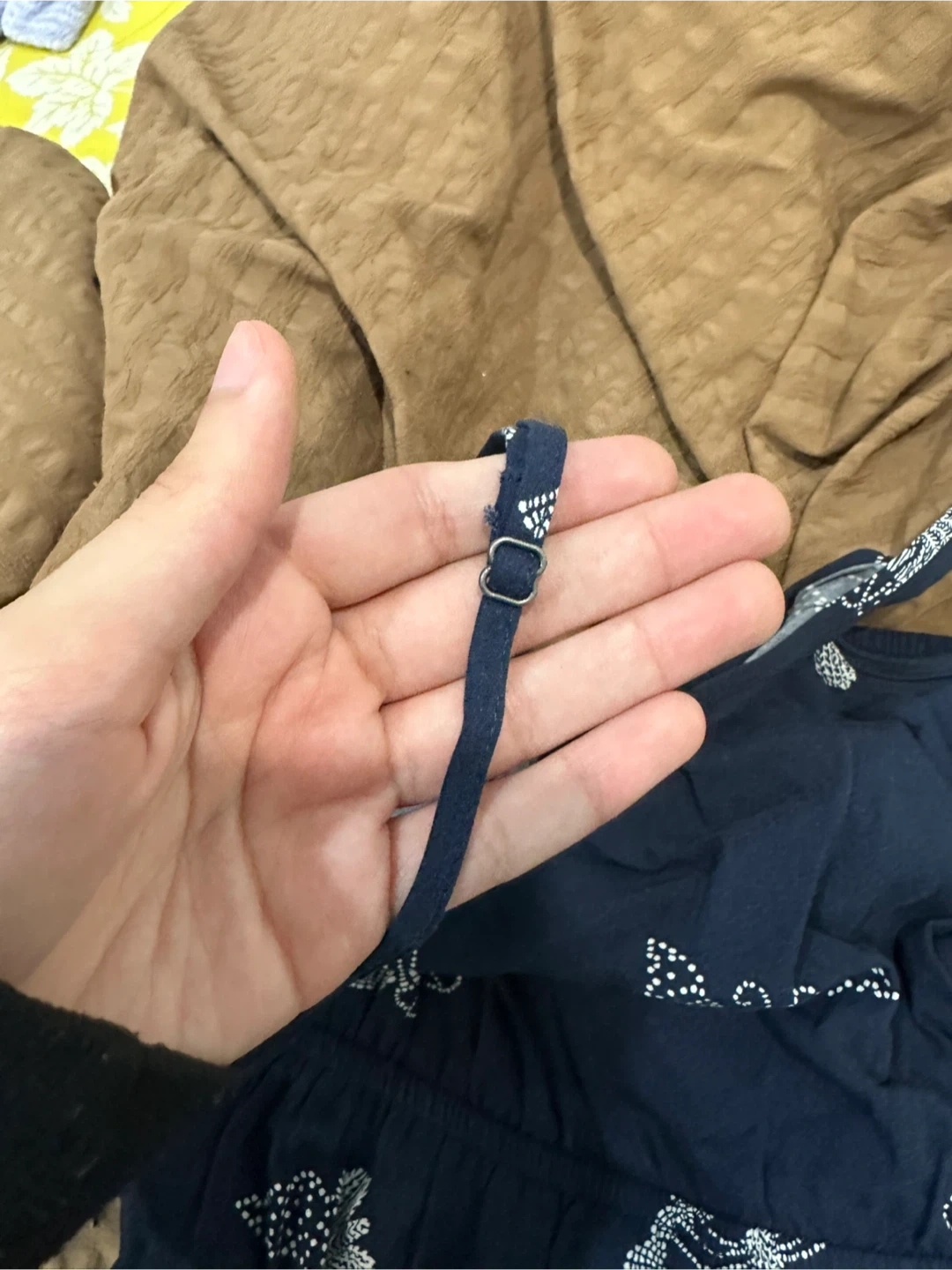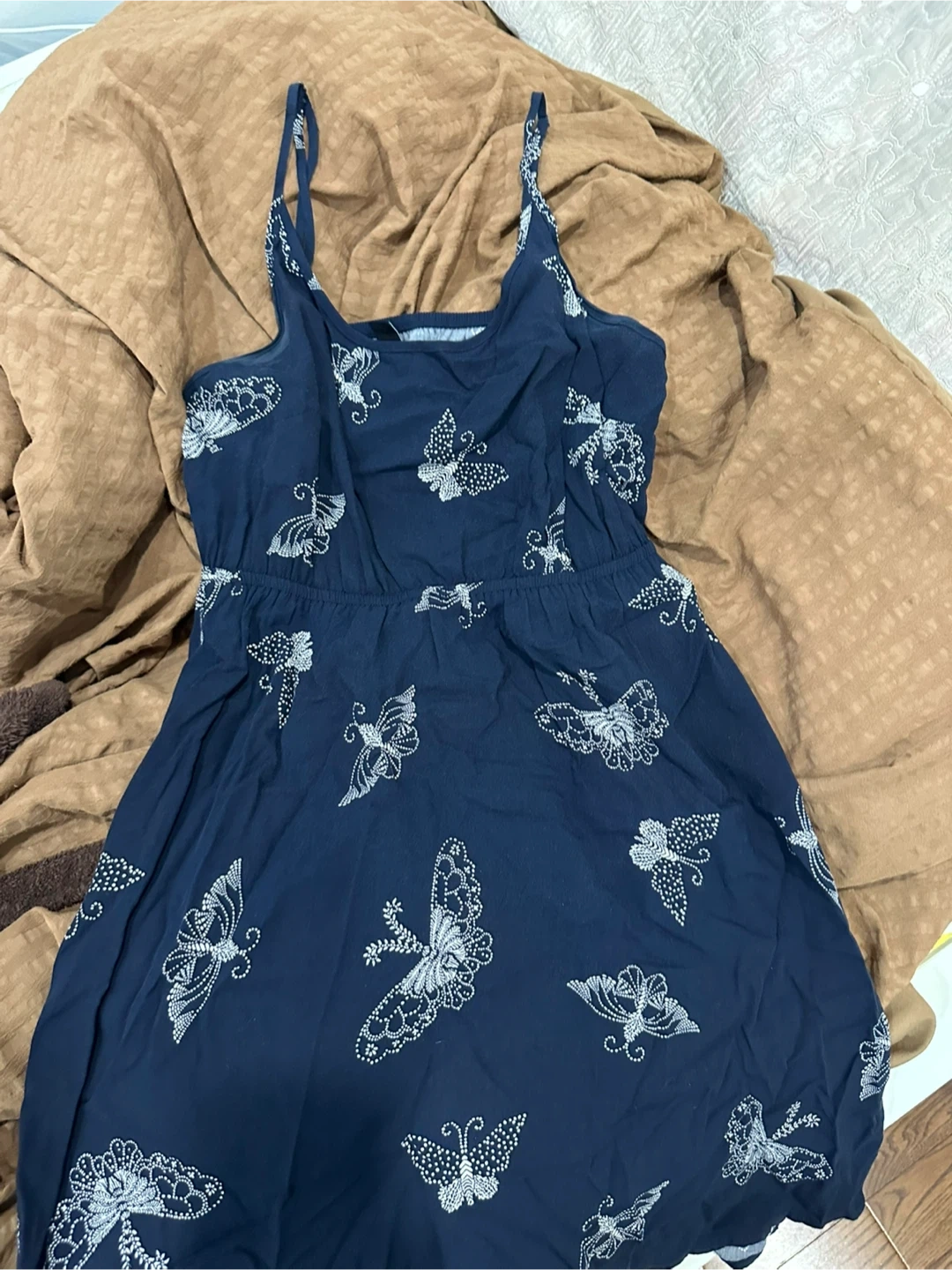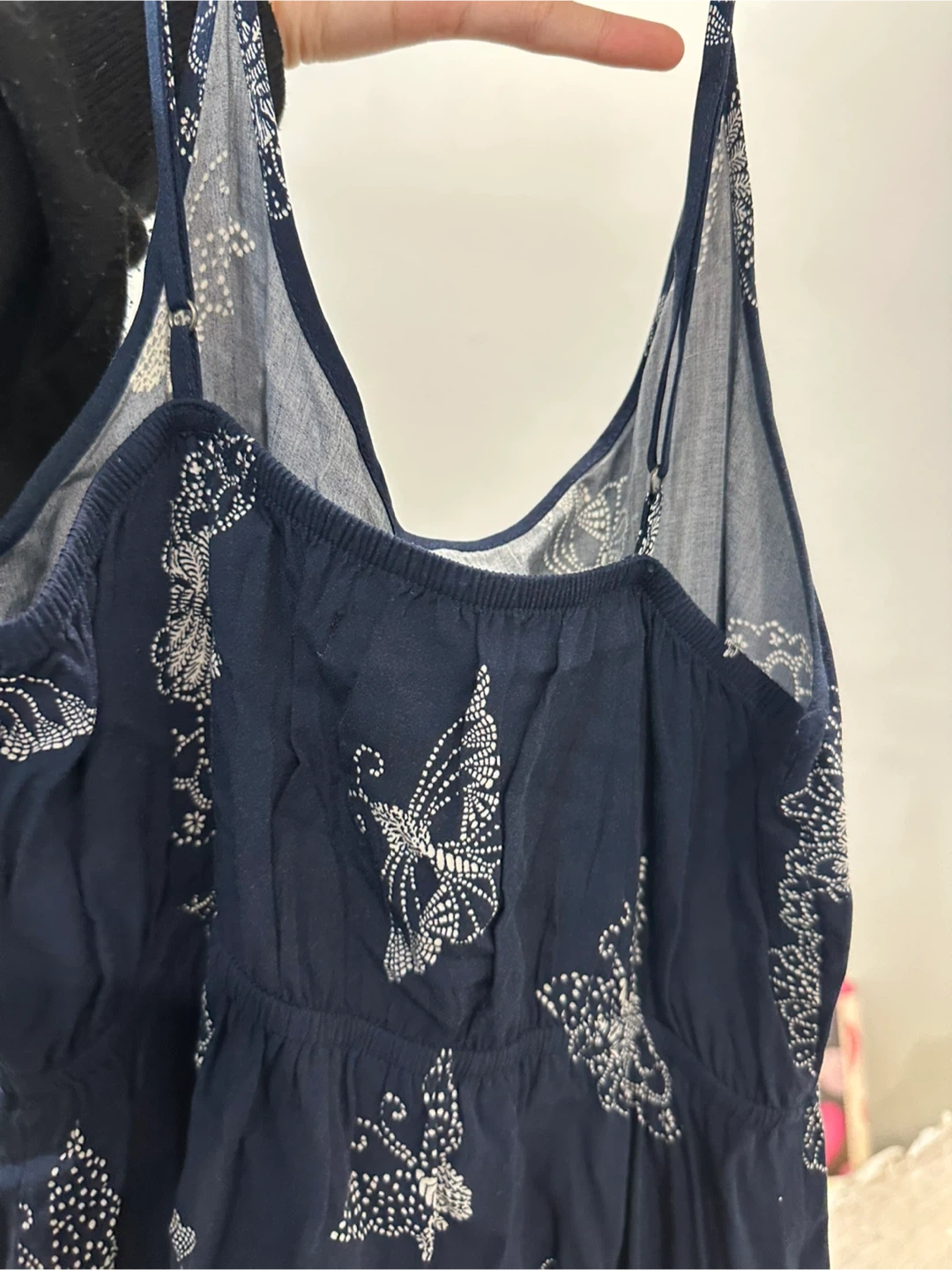 A lovely navy blue dress with a white butterfly print. It features adjustable spaghetti straps and an elasticized empire waist. Made from lightweight fabric, it's perfect for warmer weather!