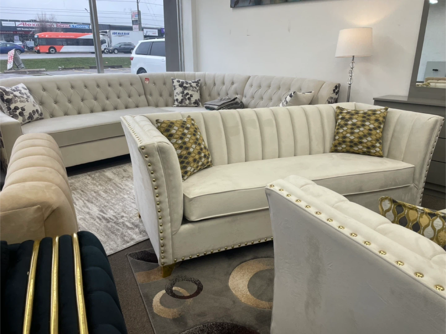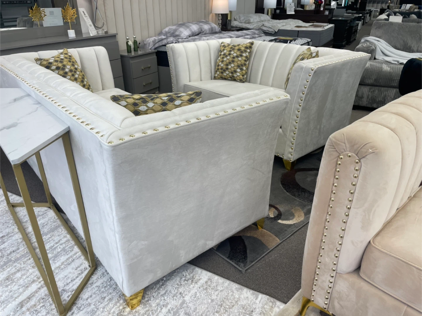 Cream Velvet Sectional Sofa with Gold Accents