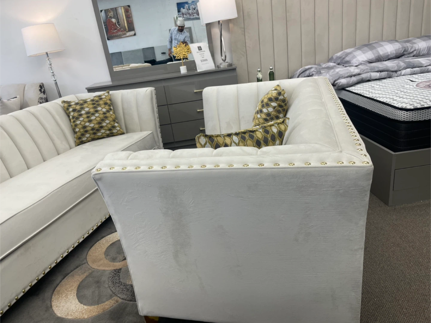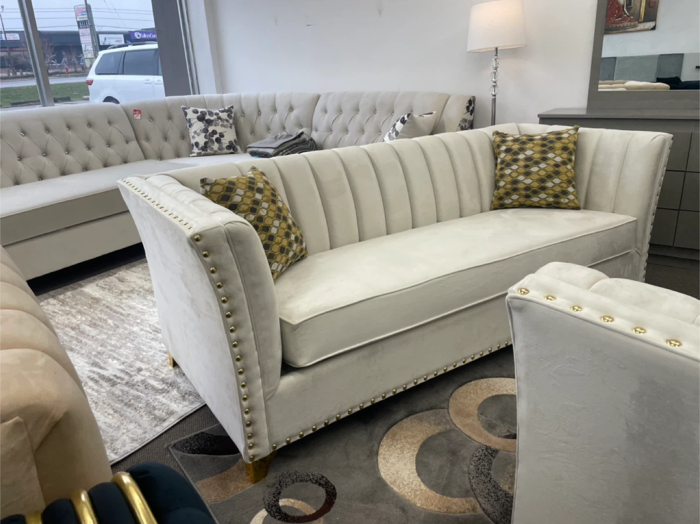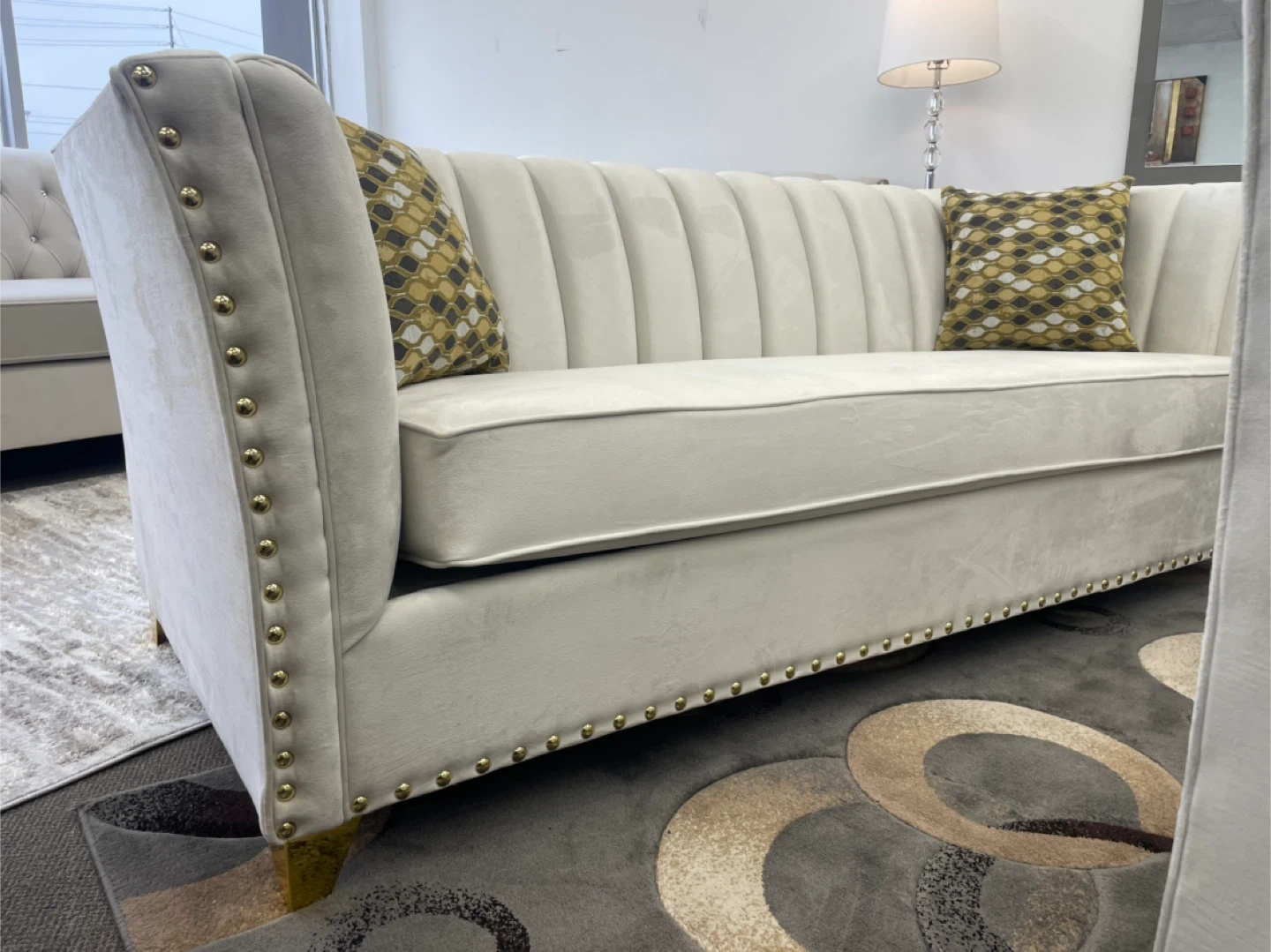 This elegant sectional sofa features a plush cream velvet upholstery and is adorned with decorative gold nailhead trim. It includes accent pillows with a stylish geometric pattern. Its channel-tufted back and rolled arms add a touch of classic charm, while the gold-finished legs provide a modern flair. This piece offers ample seating for your living room.