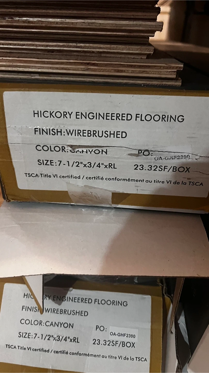 Hickory engineered flooring with a wirebrushed finish. Color is Canyon. Size is 7-1/2" x 3/4"xRL. Each box contains 23.32 SF. 12 full boxes available 279 sq feet