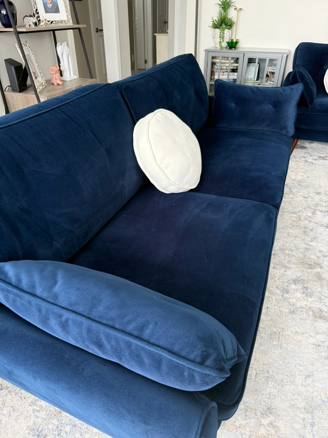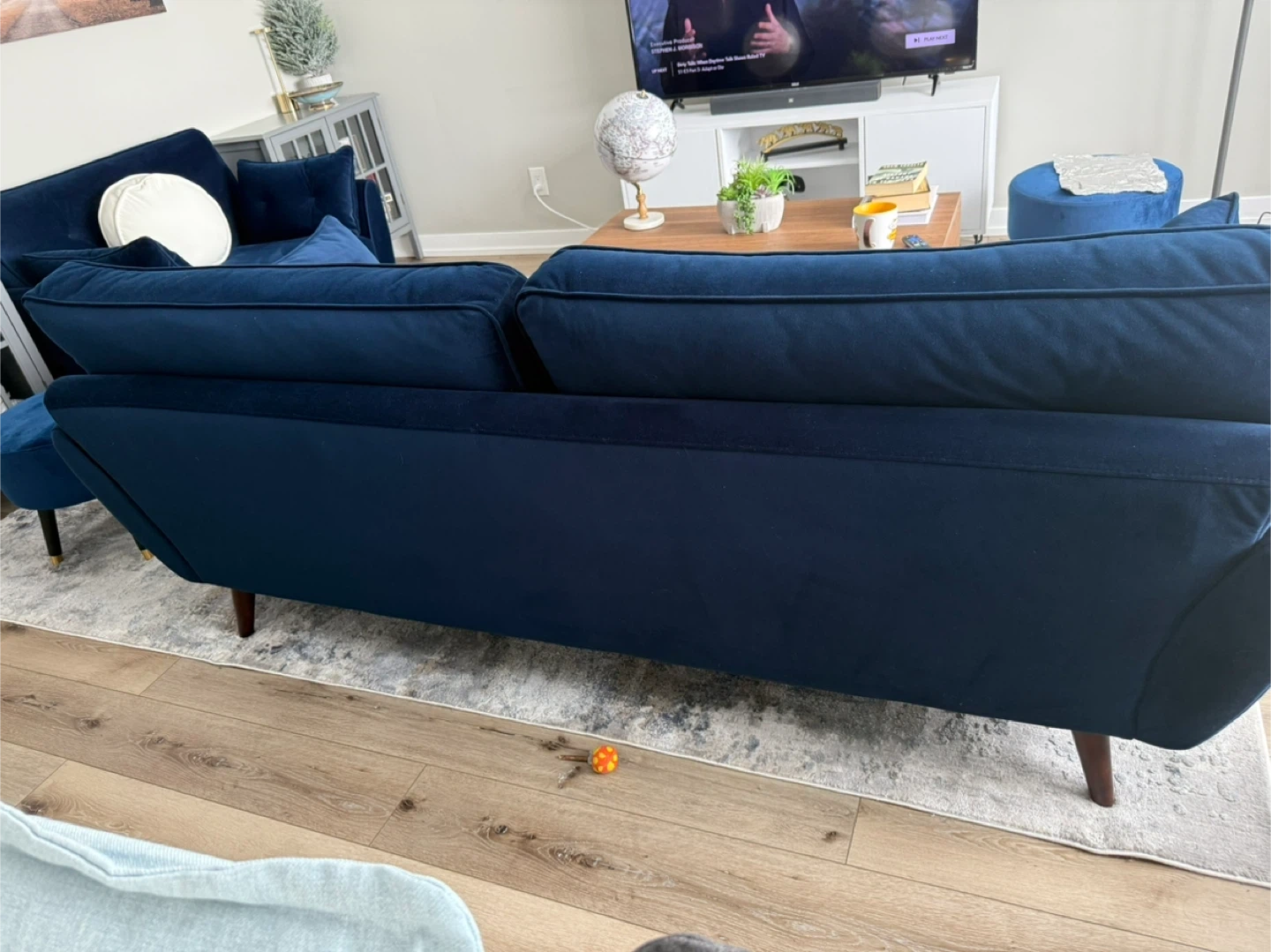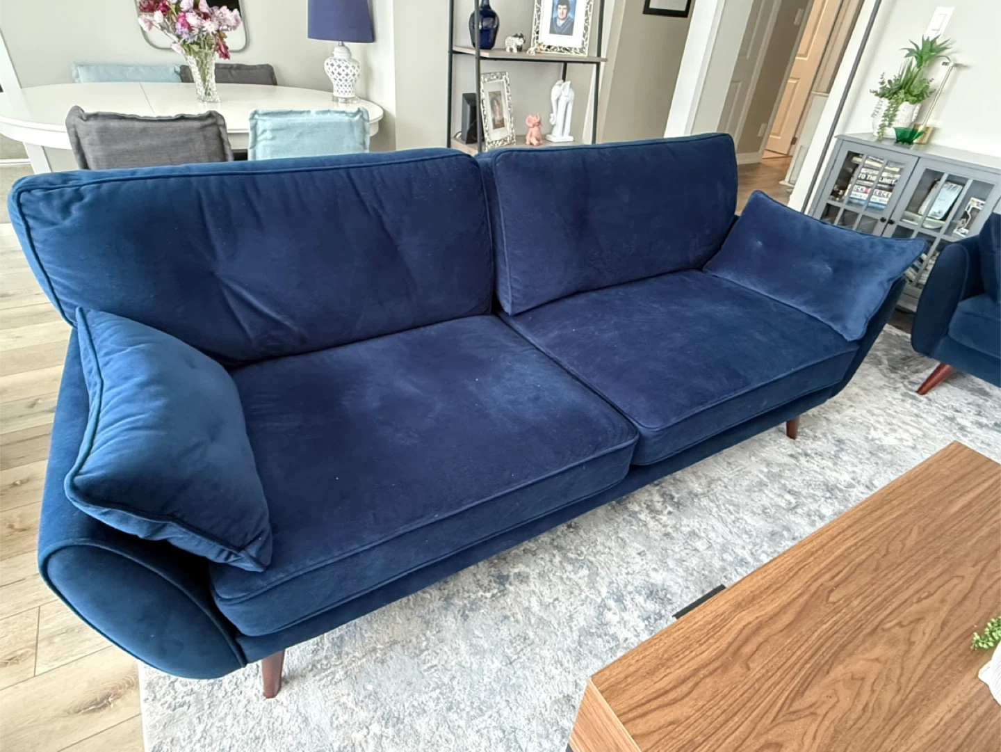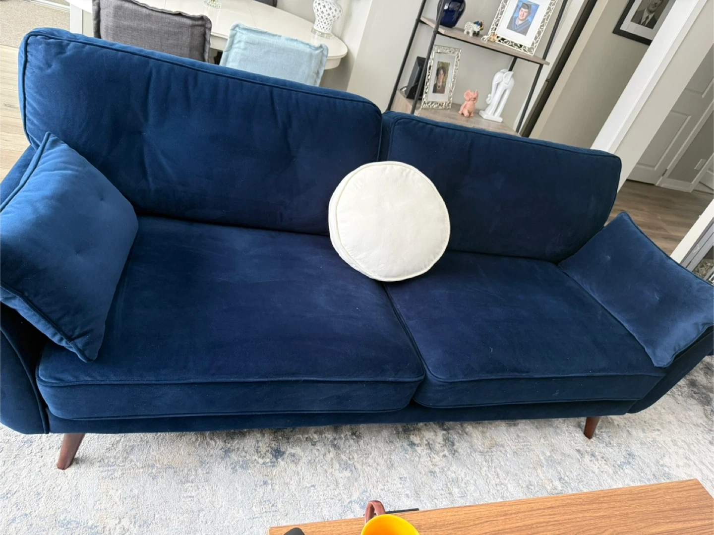 Comfortable dark blue velvet sofa with plush cushions. It comes with two accent pillows and wooden legs. This sofa offers a cozy seating experience for any living room.