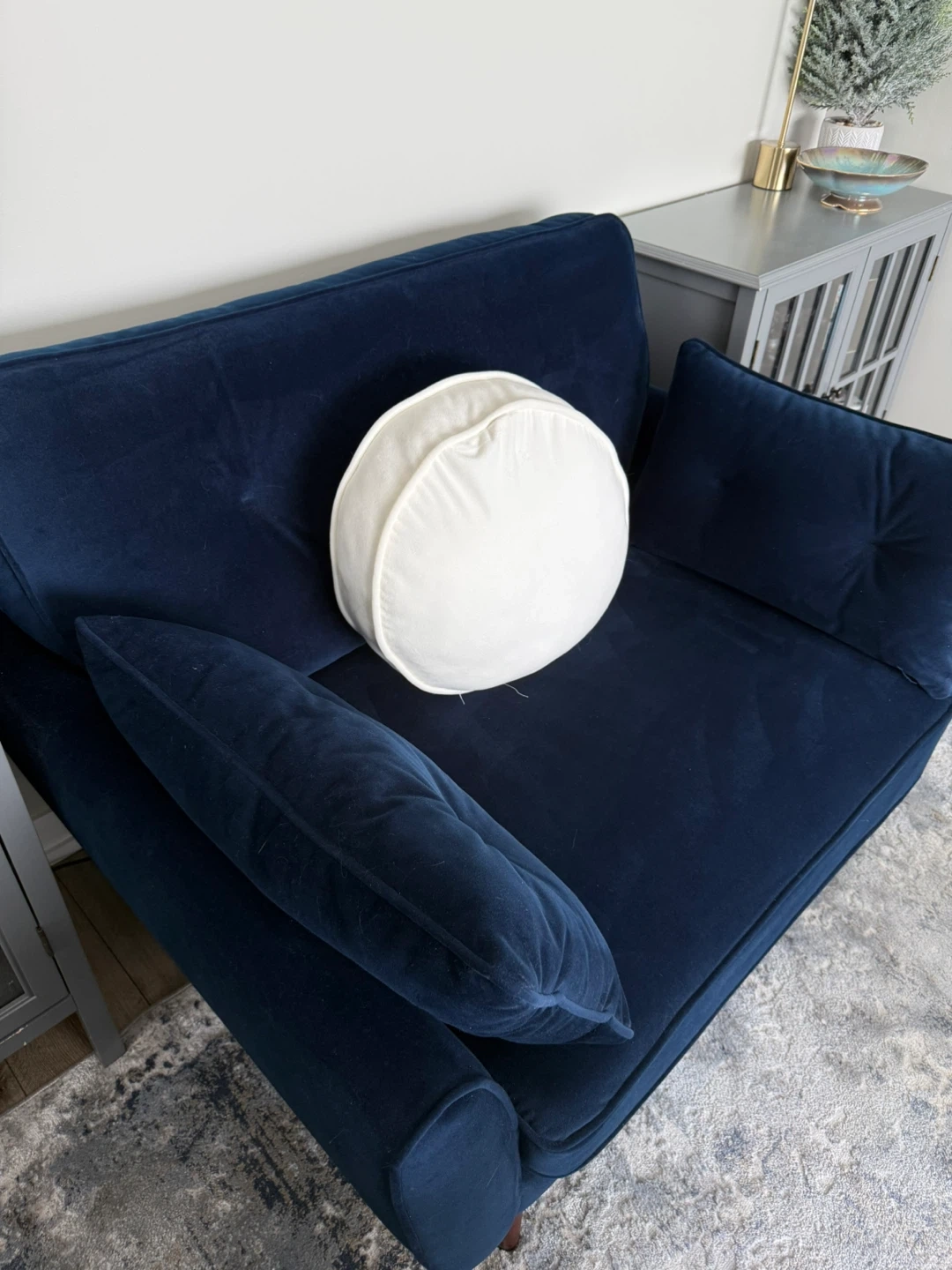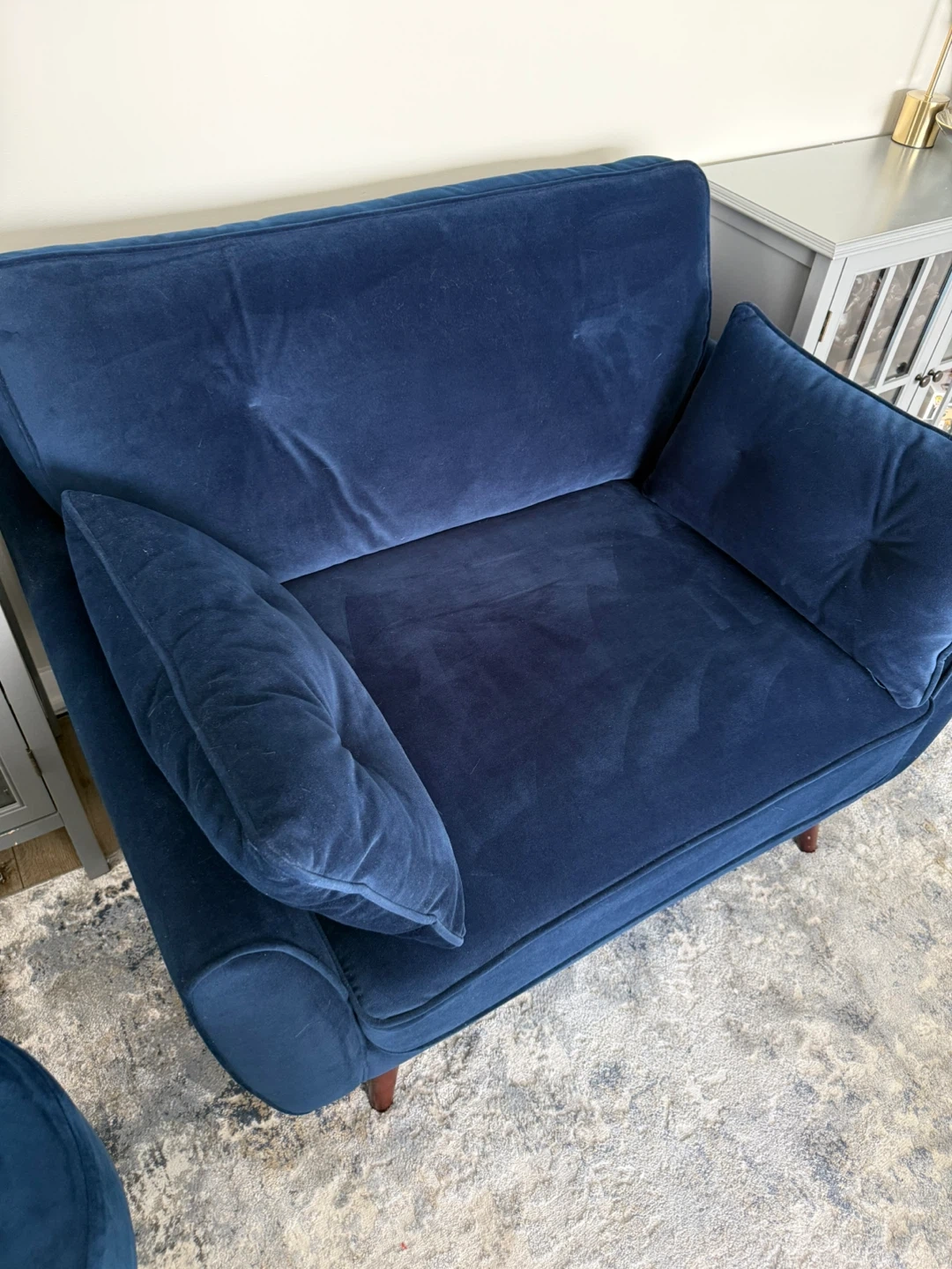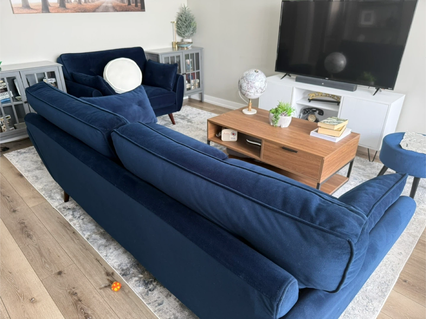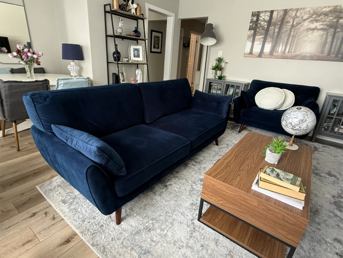 Comfortable dark blue velvet sofa with plush cushions. It comes with two accent pillows and wooden legs. This sofa offers a cozy seating experience for any living room.