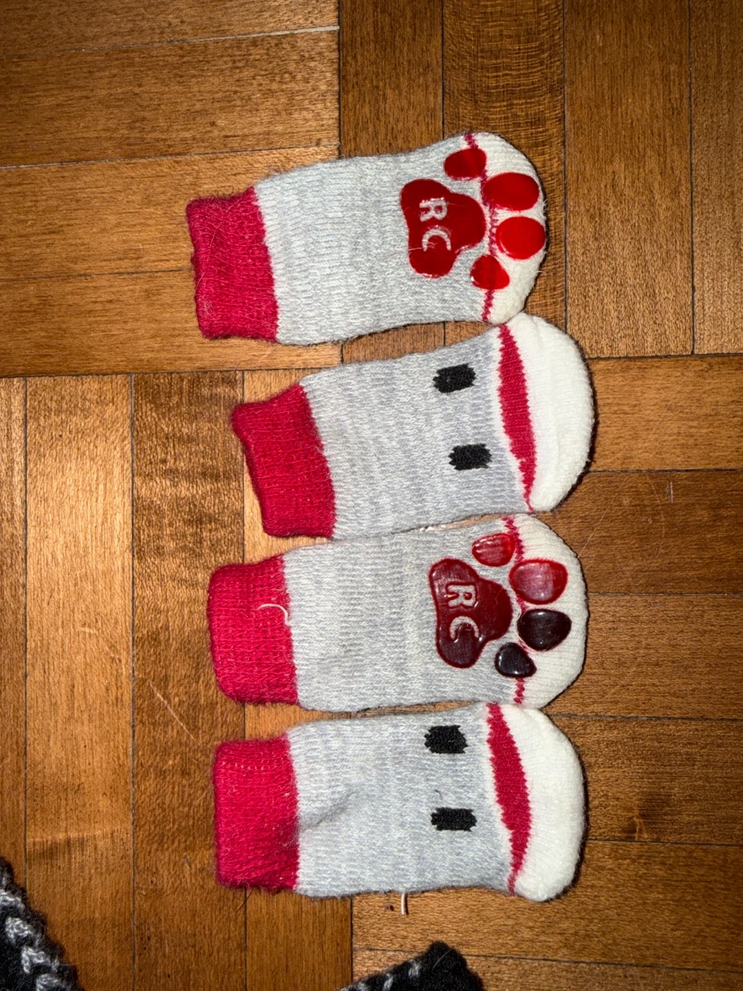 Size SMALL in hat and scarf. Socks are XS and come with grip under.