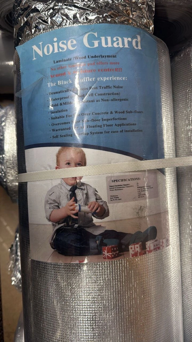 Noise Guard laminate/wood underlayment. It dramatically reduces foot traffic noise and is waterproof. It's also mold and mildew resistant, making it non-allergenic. Suitable for use over concrete and wood sub-floors, it overcomes most sub-floor imperfections