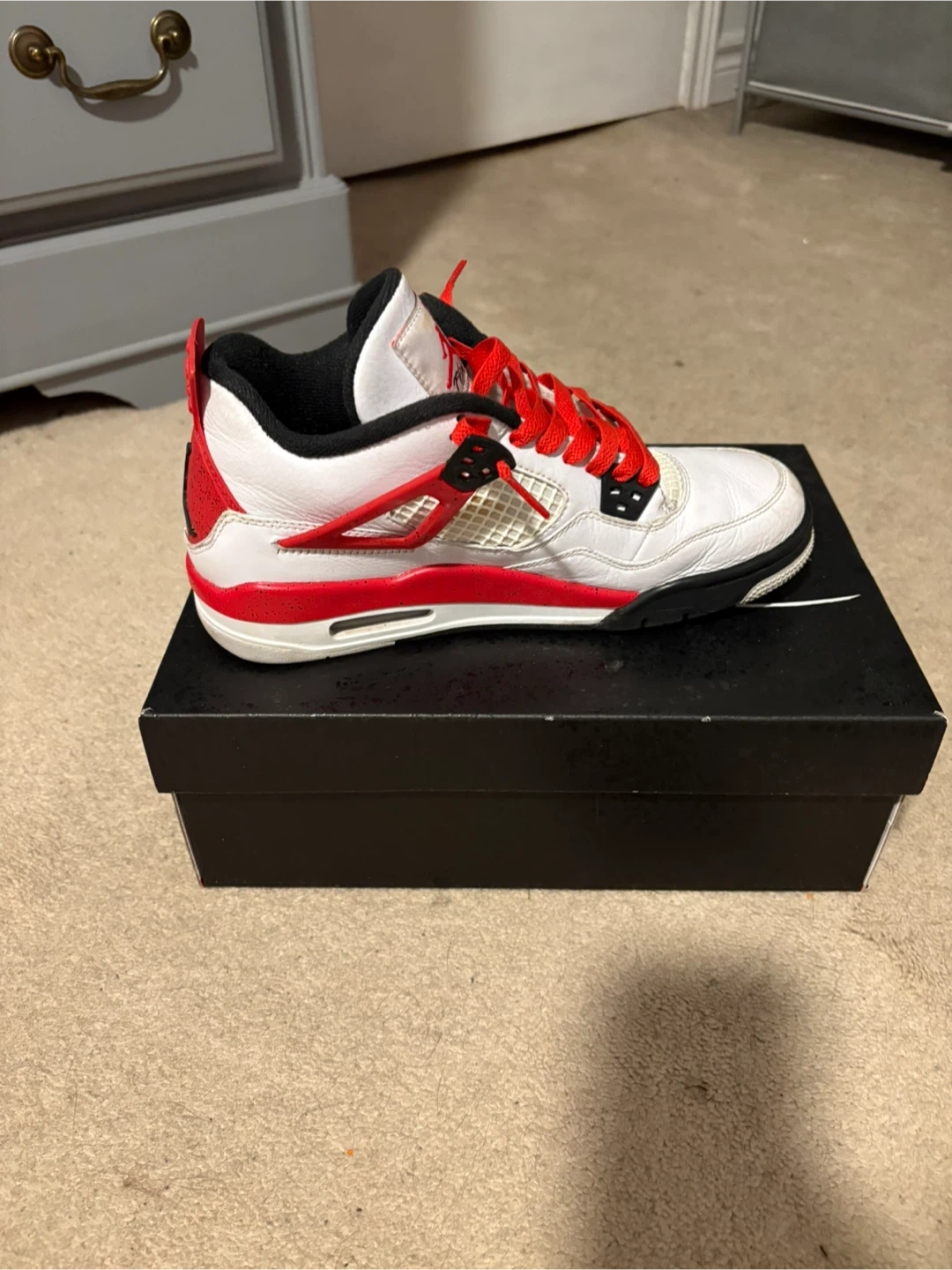 Selling a pair of Air Jordan 4 Retro (GS) sneakers in size 7Y. The colourway is White/Fire Red-Black. Comes with the original box!