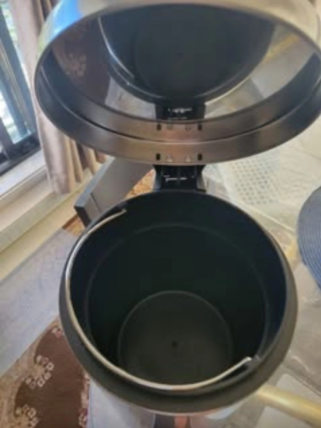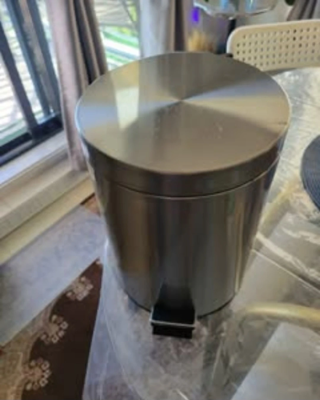 A stainless steel step trash can. It has a pedal for easy opening. This is a great addition to any kitchen or bathroom!