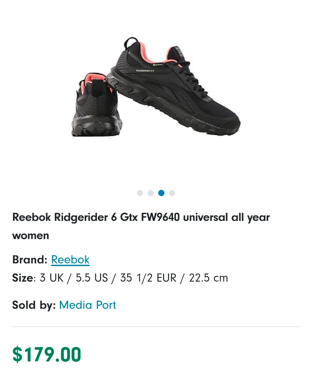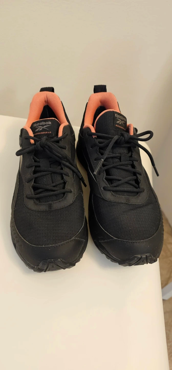 These are Reebok Ridgerider 6 Gtx women's trail running shoes in black and coral. They're a size 8.5 US. Gore-Tex waterproofing helps keep your feet dry.
