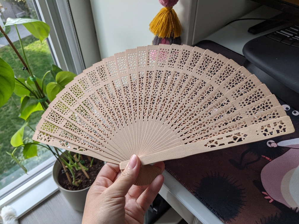 A beautiful wooden hand fan with intricate detailing.
