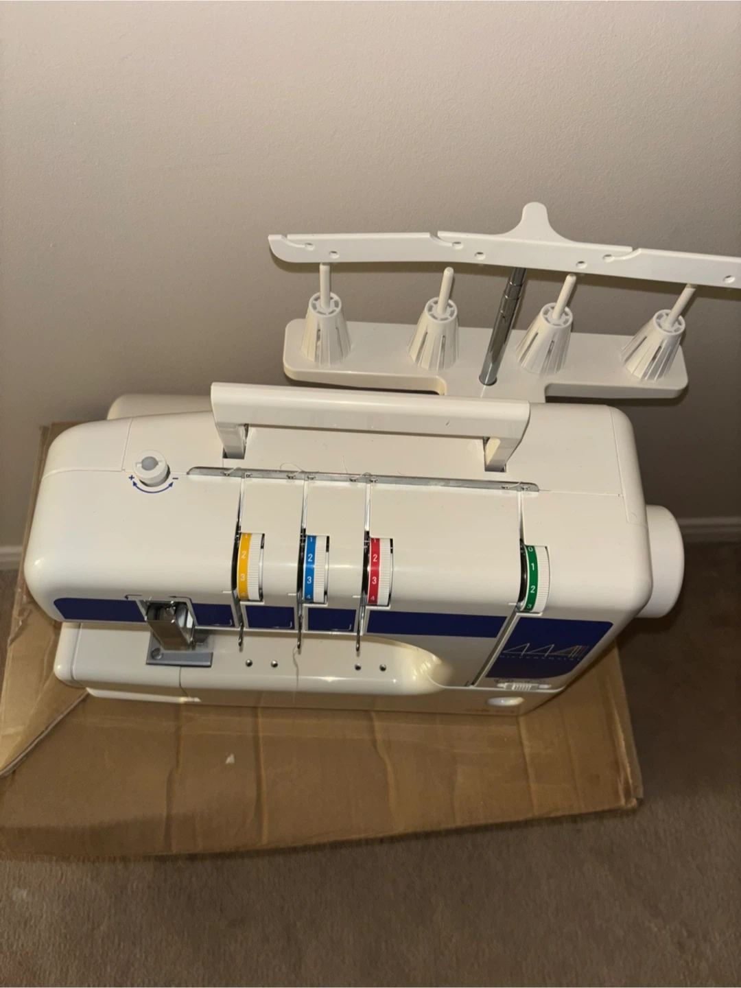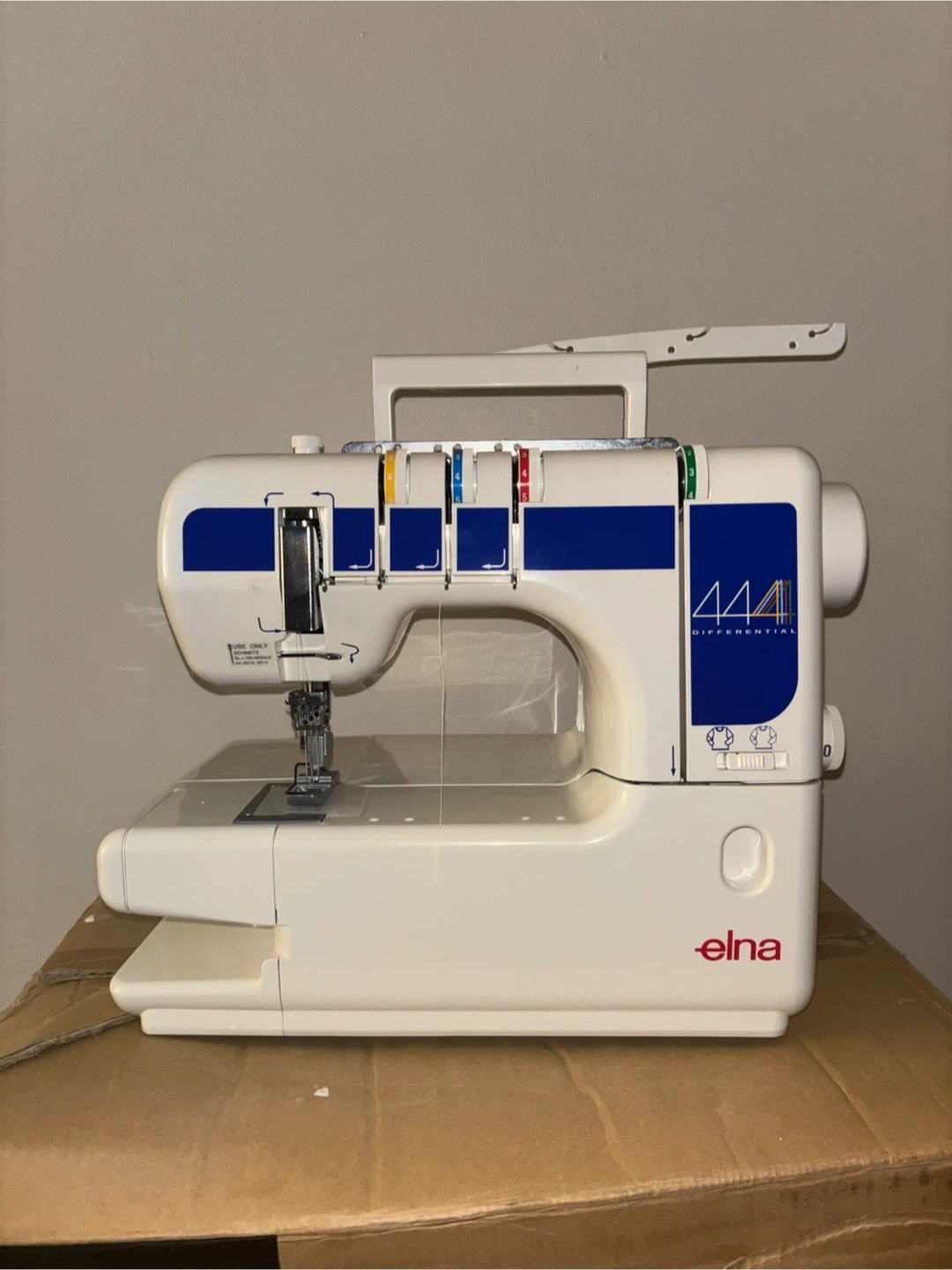 This is a white Elna 444 differential overlock sewing machine. It has multiple thread guides and tension dials for precise stitch control. This machine is useful for creating professional-looking seams on various fabrics.
