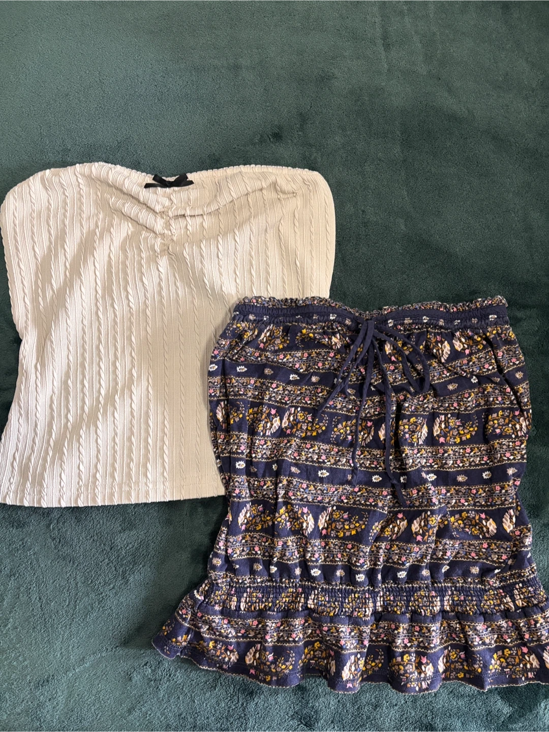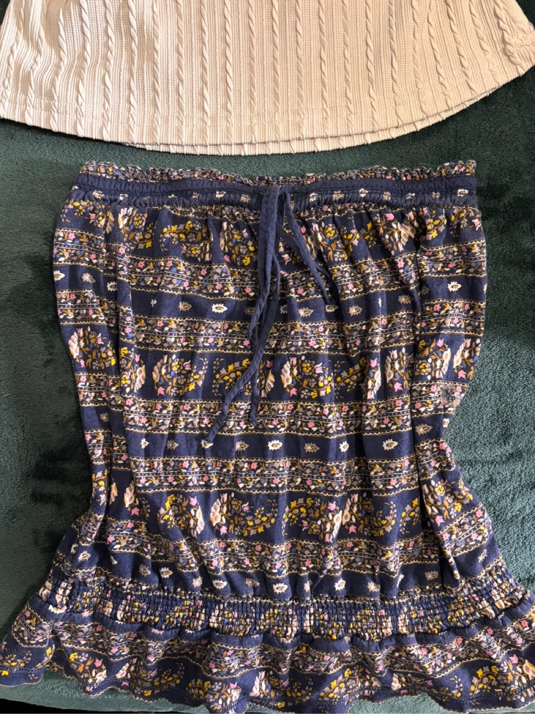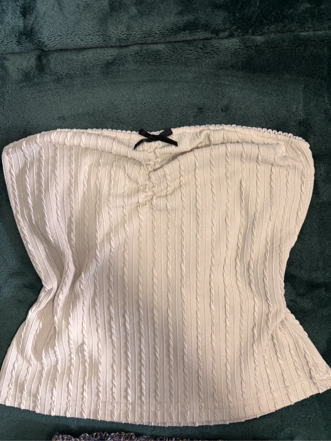 Cream cable knit tube top with a small black bow detail. A blue tube top with slight flair, and soft flower designs. These tops are perfect for warmer weather!
