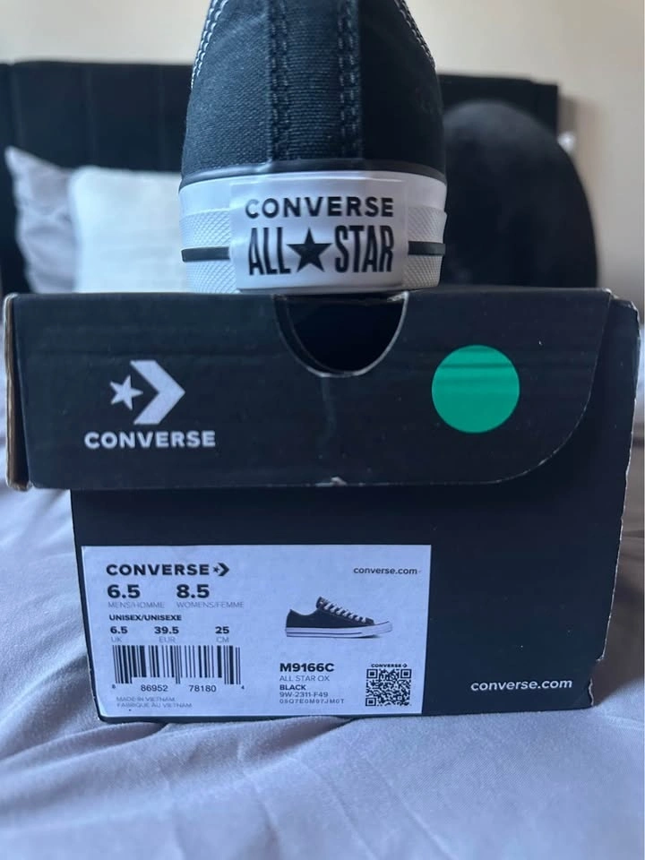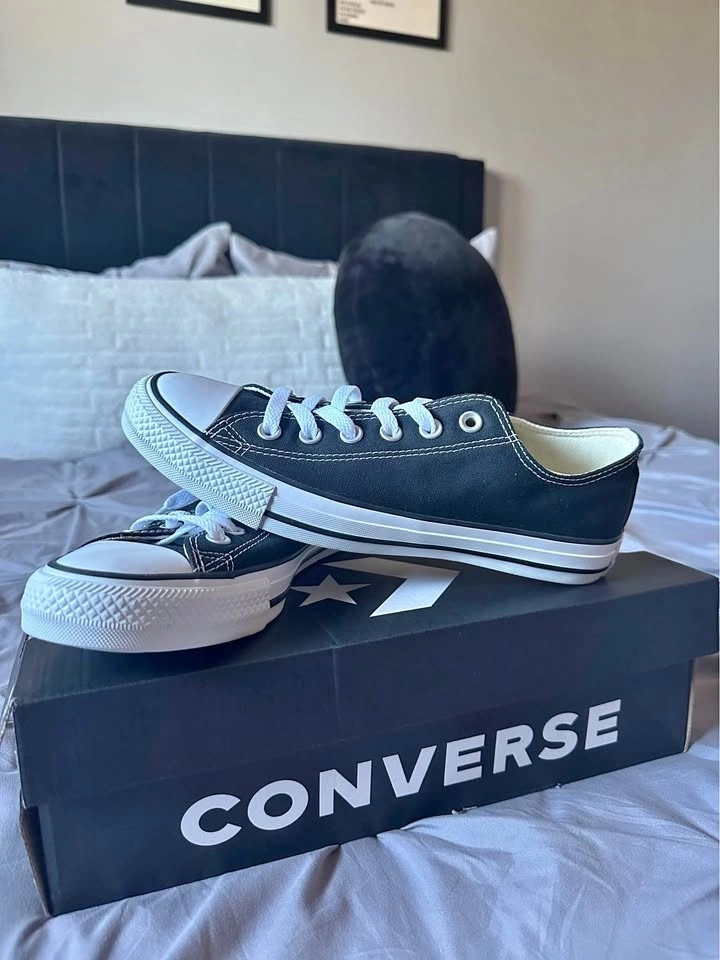 Selling a pair of brand new Converse All Star low-top sneakers in black, never worn. The size was too small, so we’re letting them go. Size: Women’s 8.5 / Men’s 6.5. Color: Black with white sole. Comes with original box. Clean, classic style and perfect for everyday wear.