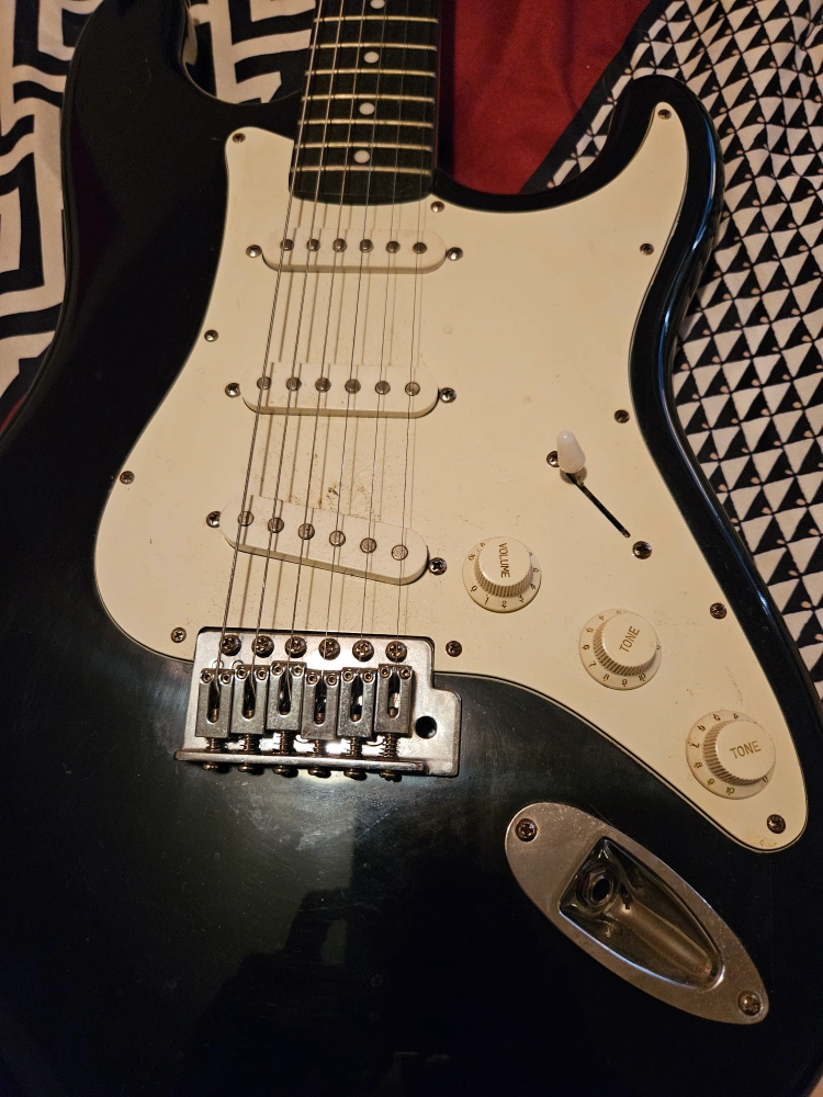 A black electric guitar. White pickguard. Chrome hardware. Knobs to control the volume and tone. A great way to express yourself, and relax.