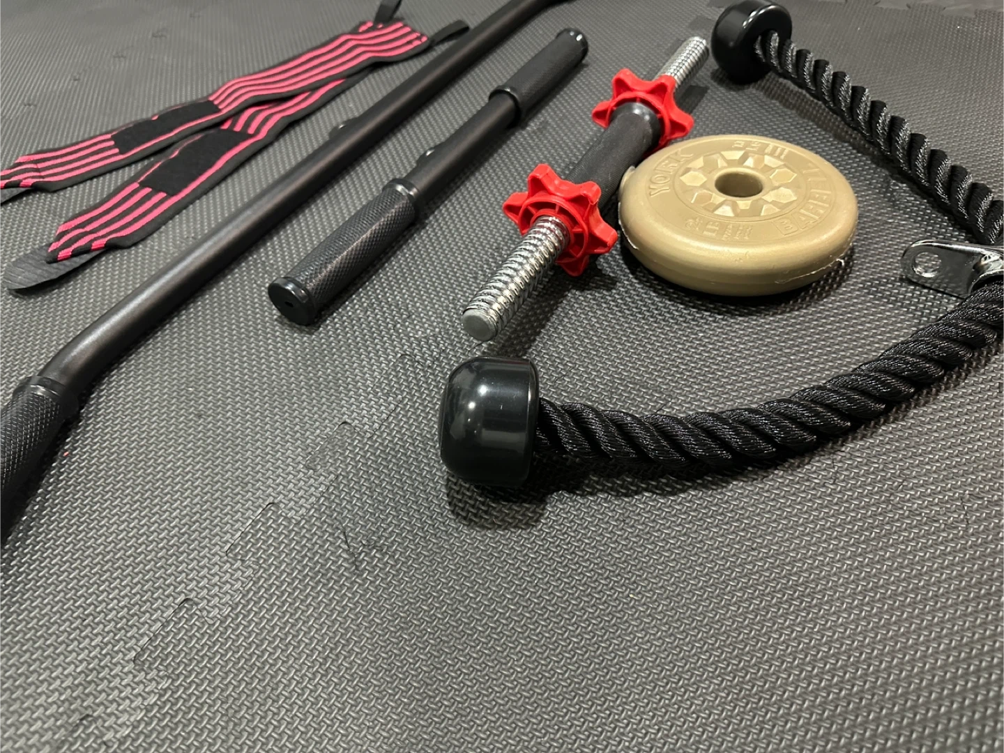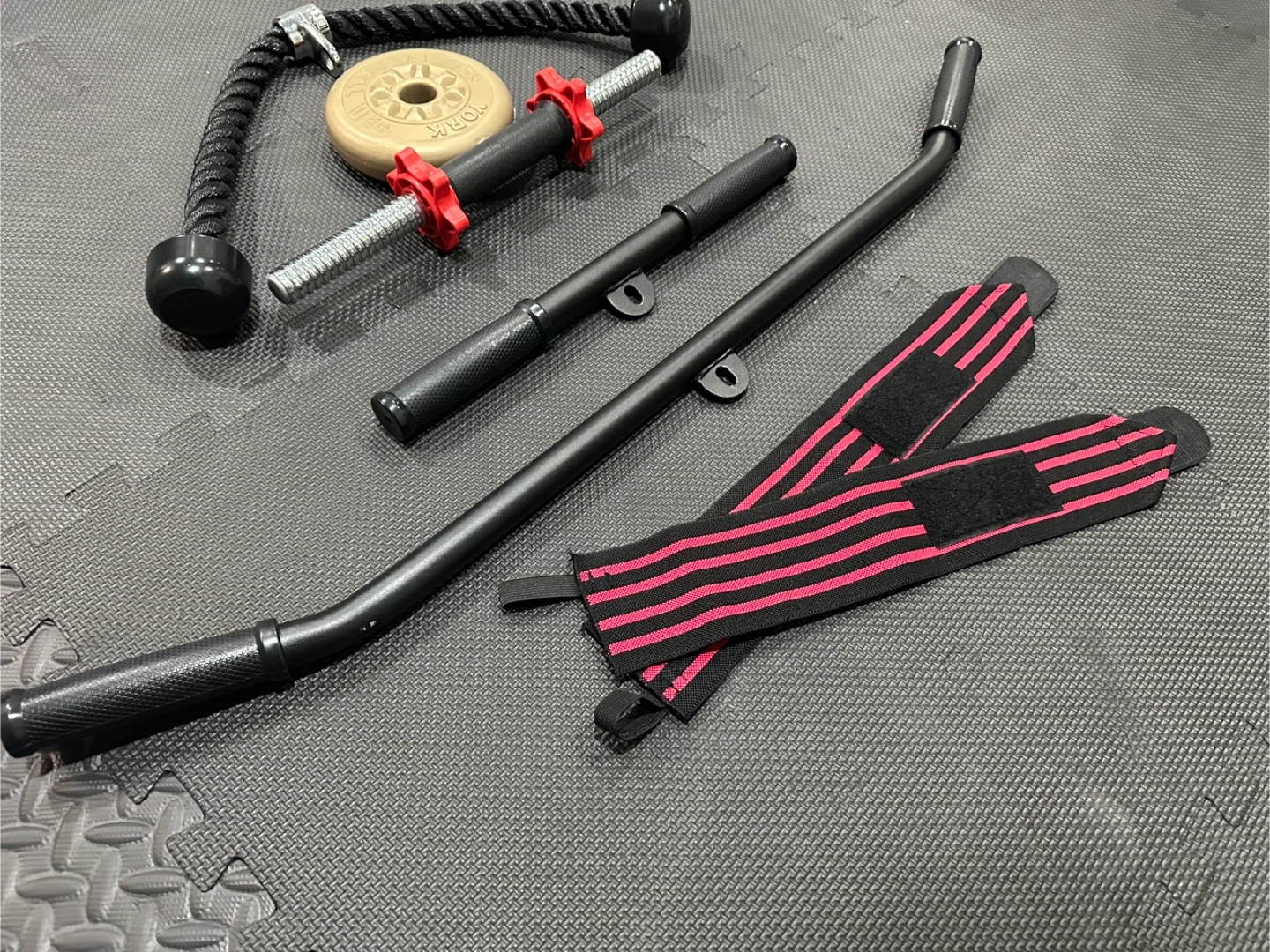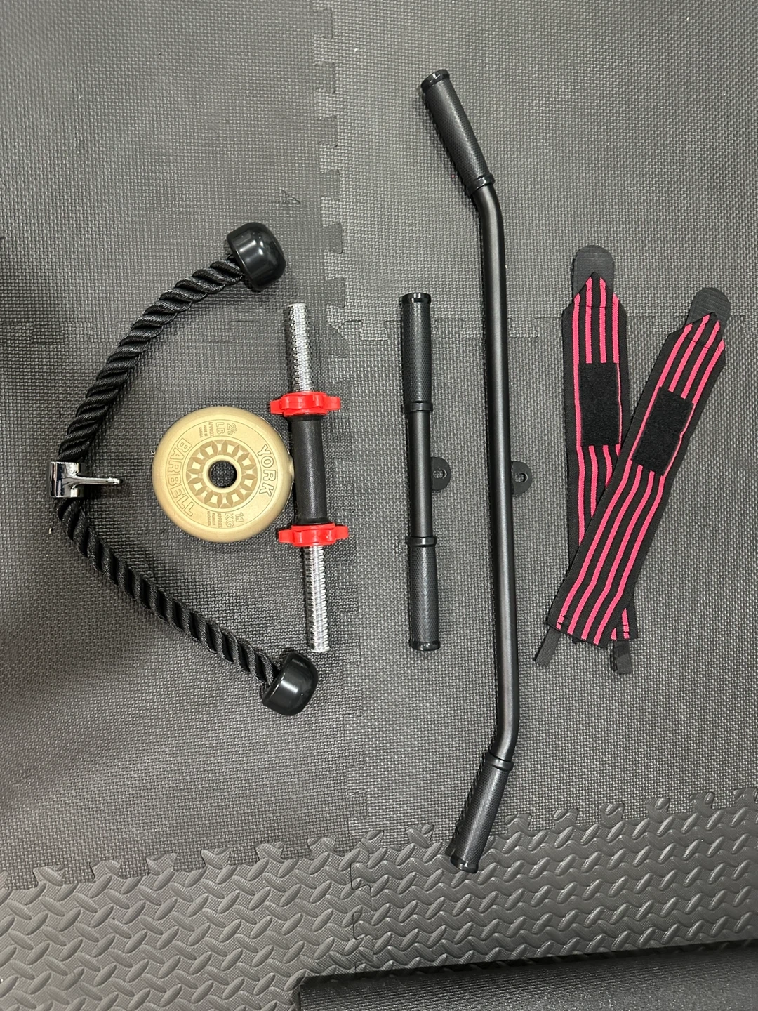Includes a triceps rope, a curl bar attachment, and wrist straps. Great for at-home cable machine workouts! It's a versatile set for different exercises.