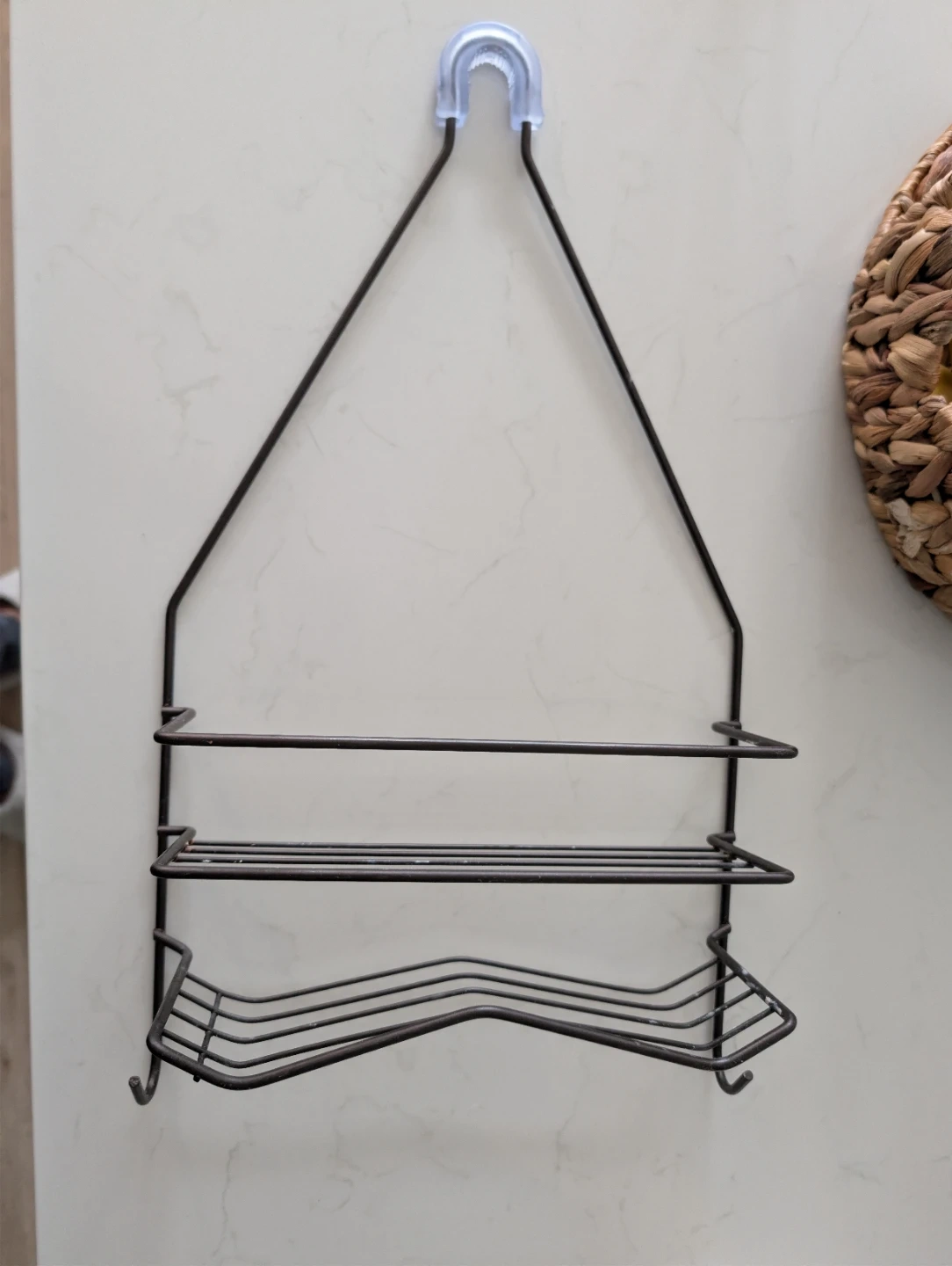 Black metal shower caddy with three hanging shelves. It has two hooks on the bottom for hanging other items. Perfect for organizing your shampoo and soap bottles in the shower!