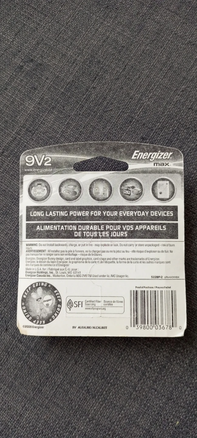 Two Energizer MAX 9V alkaline batteries. Long lasting power for your everyday devices. Made in U.S.A.