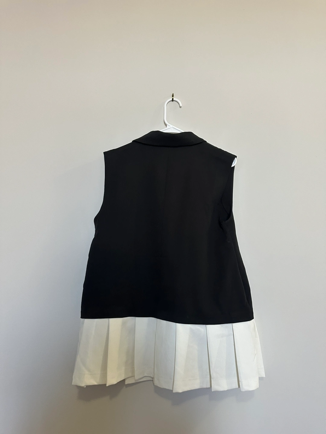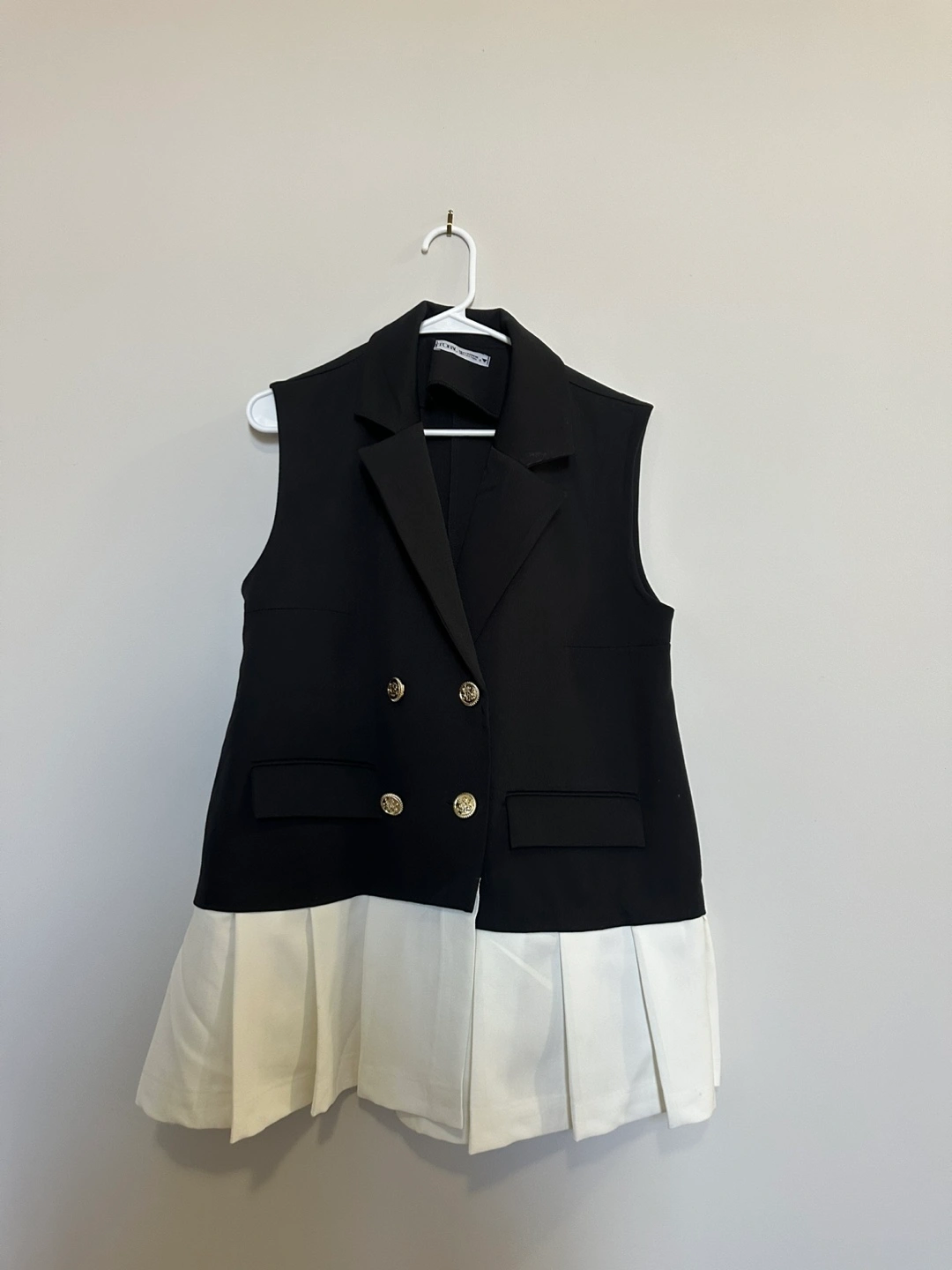 Stylish sleeveless blazer vest. Black top with a white pleated bottom. Double-breasted with gold buttons. Great for layering.
