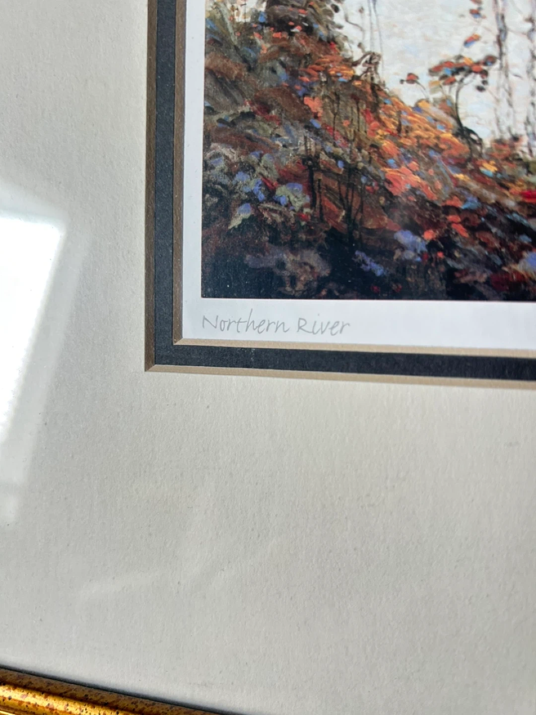 This is a framed print of "Northern River" by the artist Tom Thomson. His most popular print.