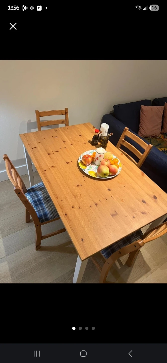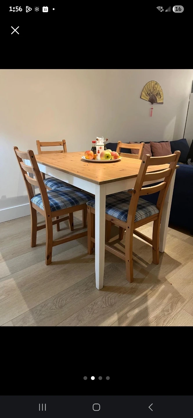 Selling a dining table with four chairs! The table has a light wood top and white legs. The chairs have a wood frame and blue plaid cushions. It's in good condition and ready for a new home!
