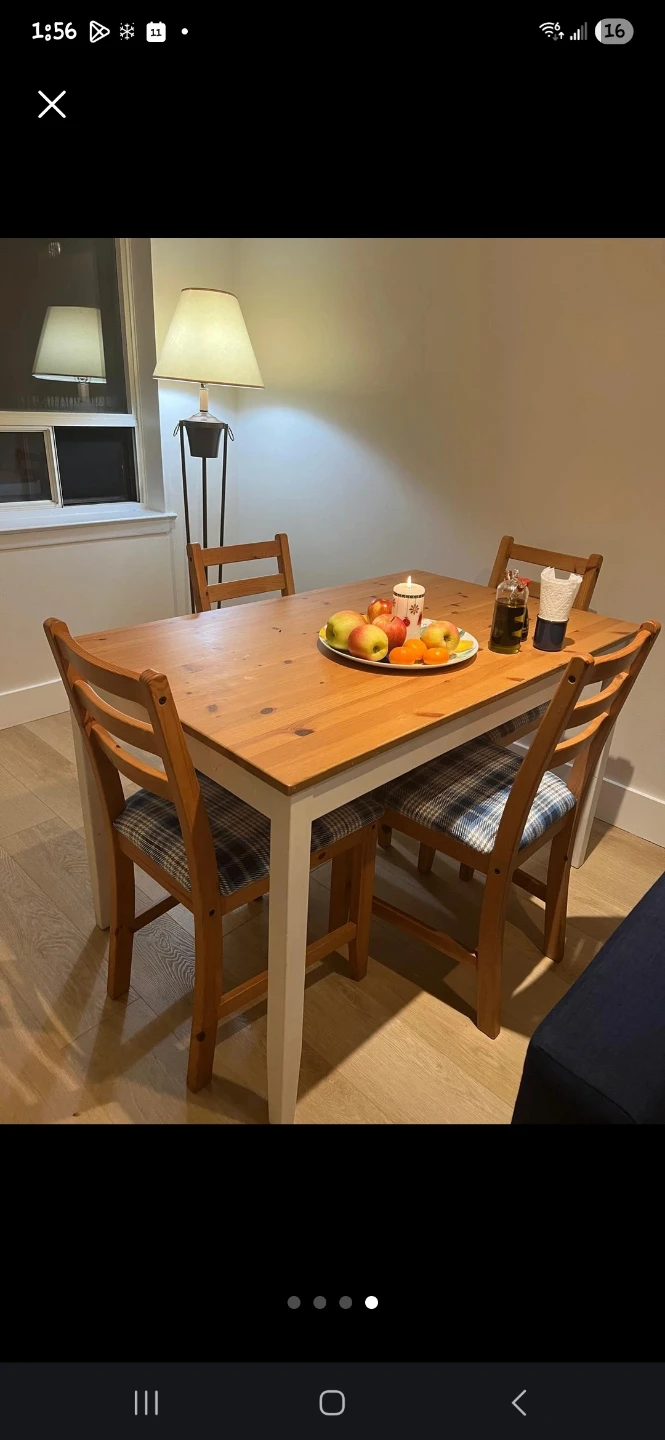 Selling a dining table with four chairs! The table has a light wood top and white legs. The chairs have a wood frame and blue plaid cushions. It's in good condition and ready for a new home!