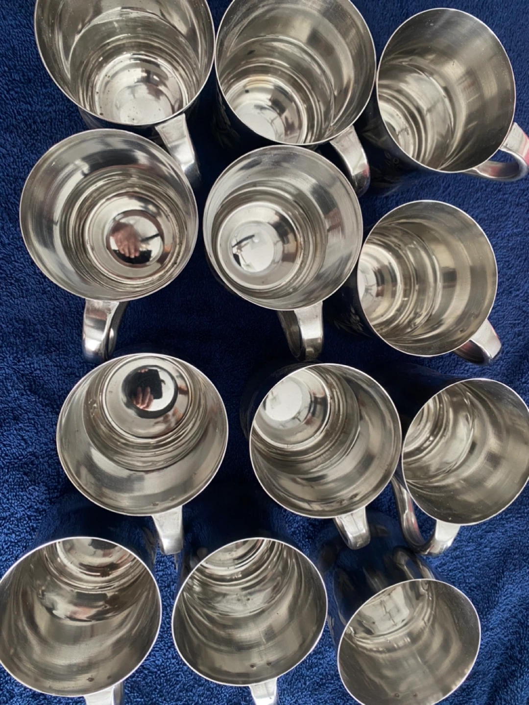 This is a set of 12 stainless steel cups. They feature a delicate floral design etched onto the exterior. Metal cups like these are handy for outdoor gatherings or for kids.